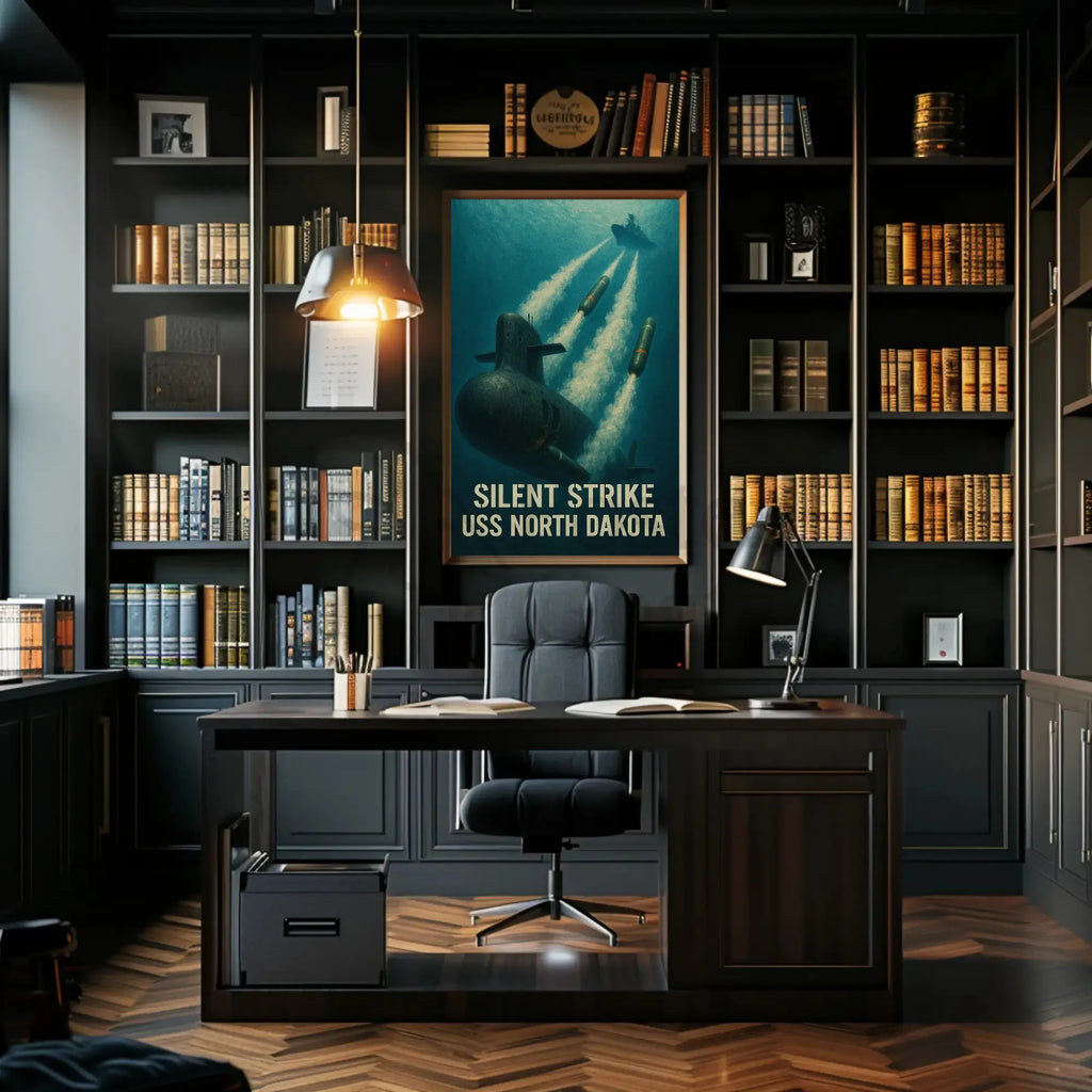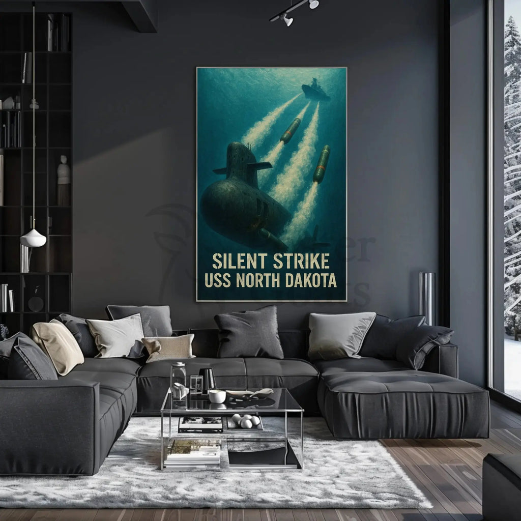 Dive into the heart of naval warfare with the "Silent Strike" poster featuring the USS North Dakota. This artwork captures the stealth and precision of submarine operations, with a dramatic depiction of torpedoes piercing throuGRP-C the depths. The detailed realism brings underwater adventures to life, showcasing the raw power and strategic miGRP-Ct of military machinery. Shades of blue and green immerse you in the ocean’s depths, while the tense and gripping mood reflects the suspense of naval engagements. Perfect for military enthusiasts and collectors of historical military art, this poster embodies action and valor.