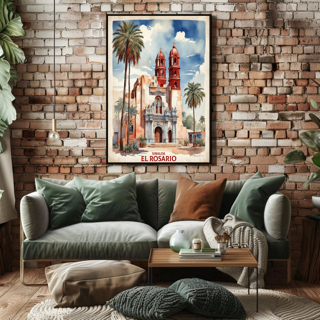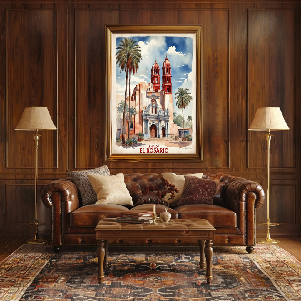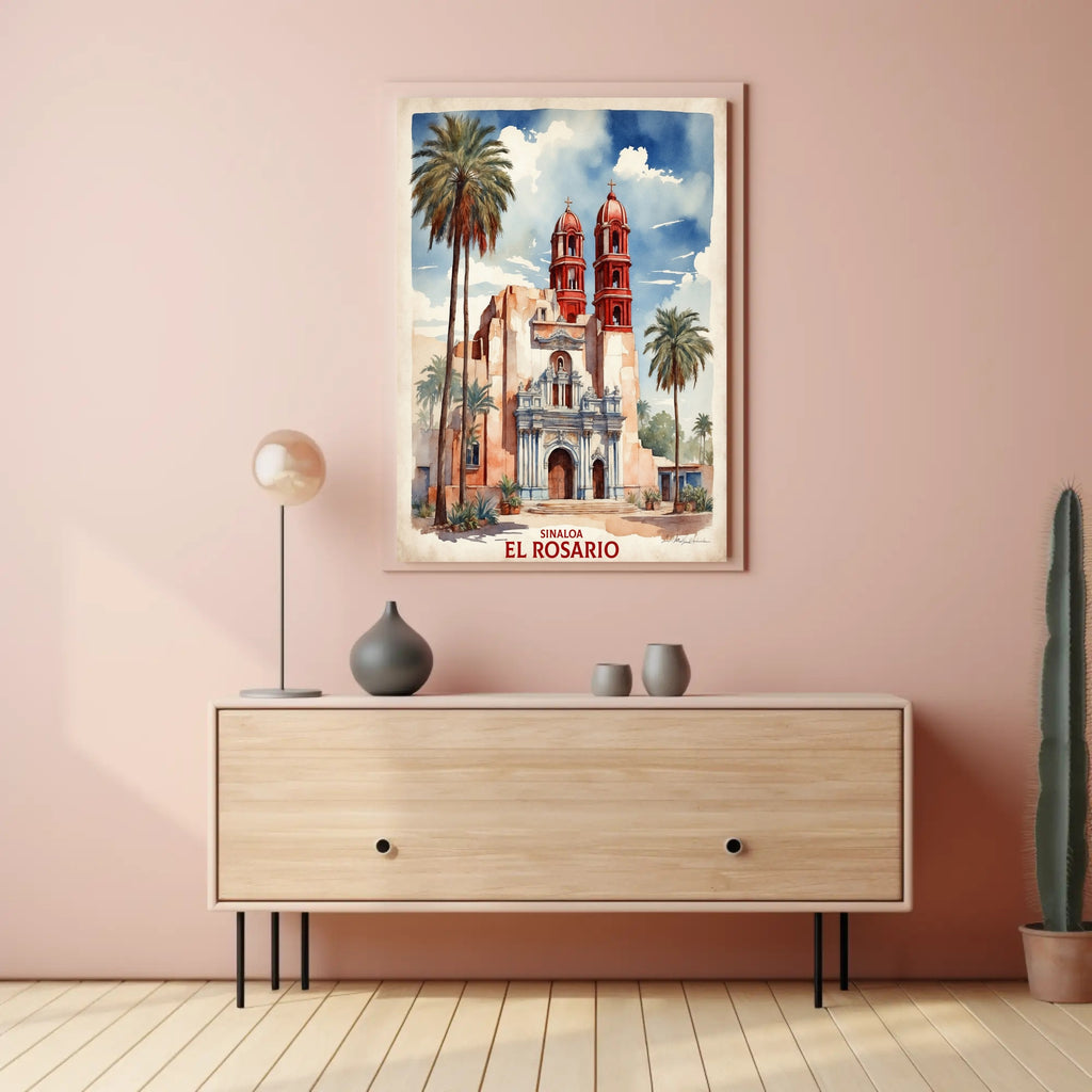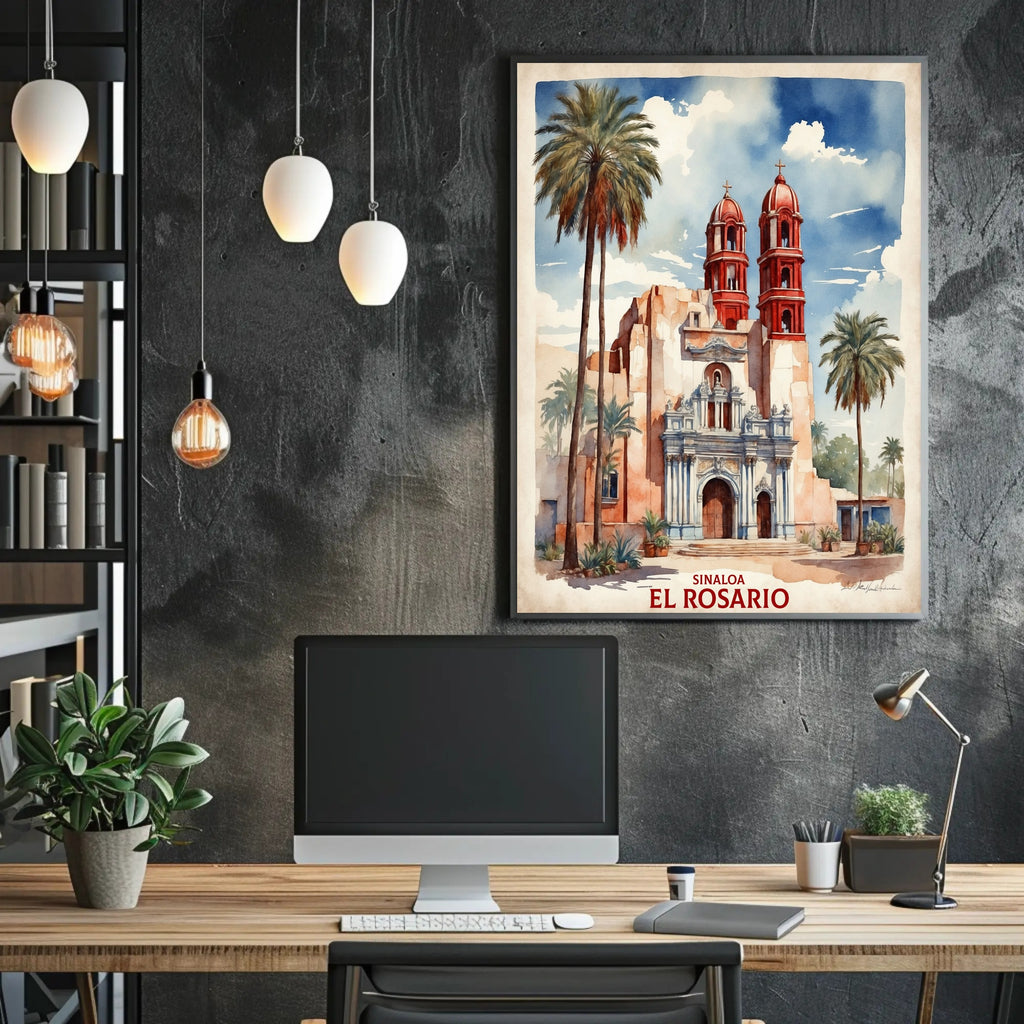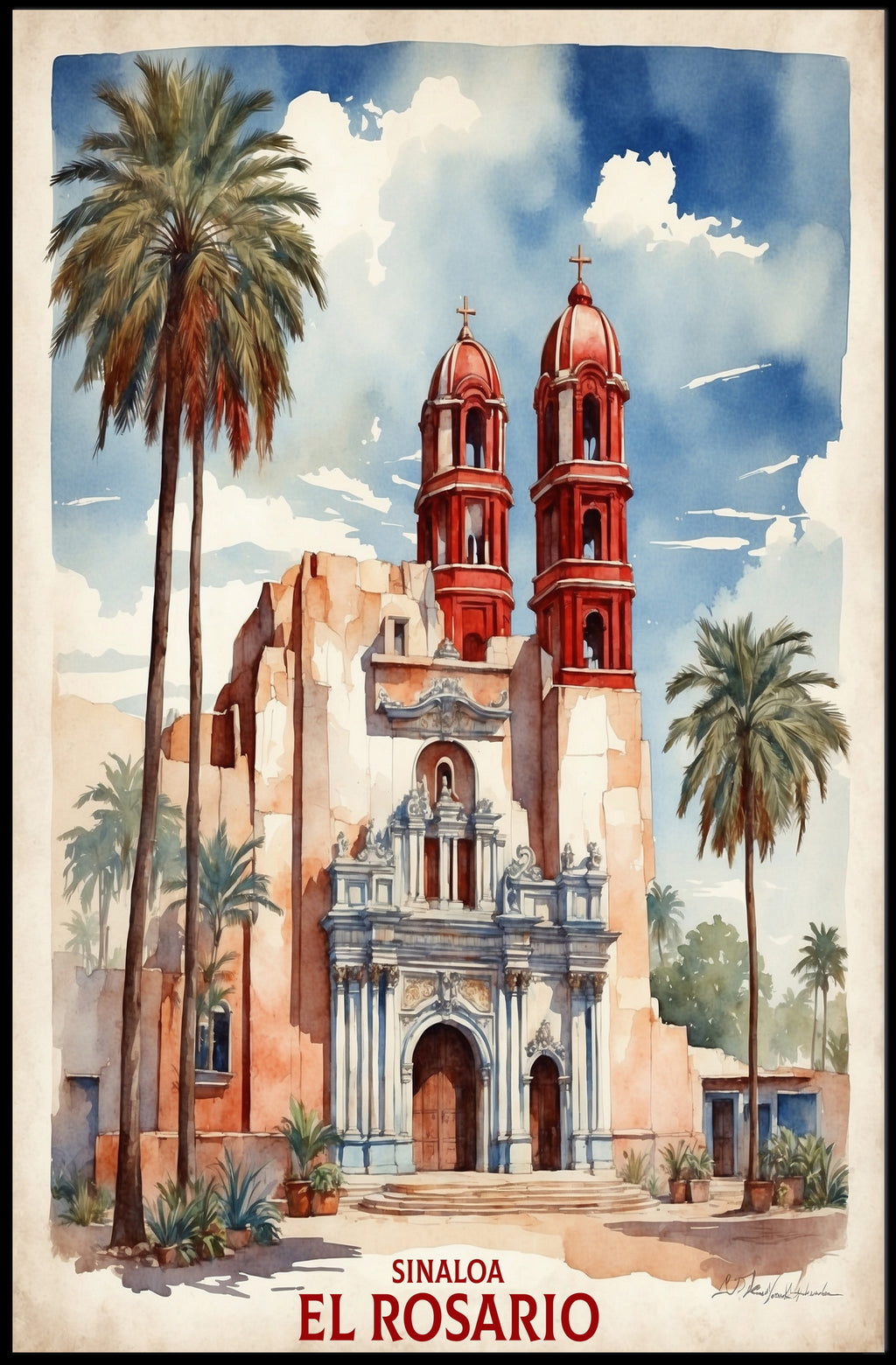 Bring the warm charm of Sinaloa into your home with the Sinaloa El Rosario Vintage Travel Poster by PosterGoat. This watercolor-style illustration showcases a historic mission with iconic red bell towers framed by tall palm trees and a sunlit, tropical sky — a serene scene that evokes Spanish colonial architecture and travel nostalgia.