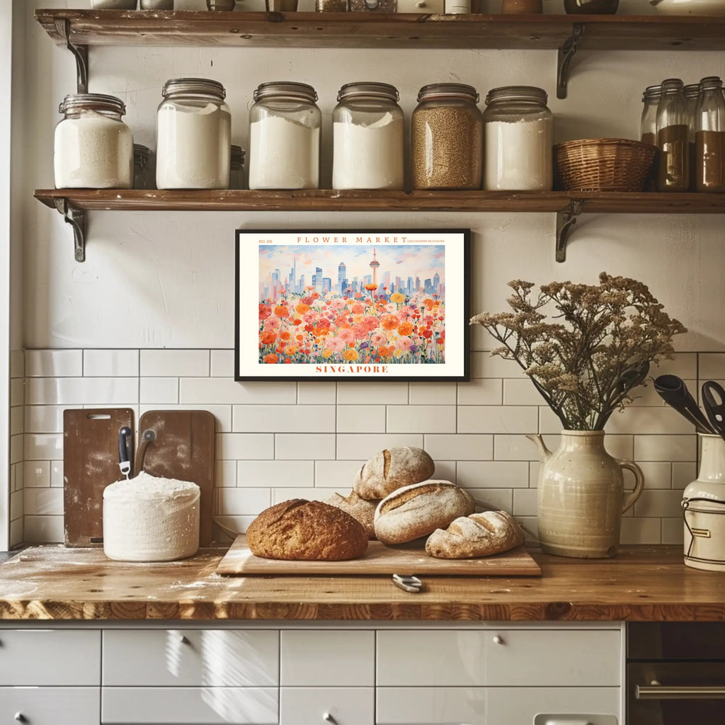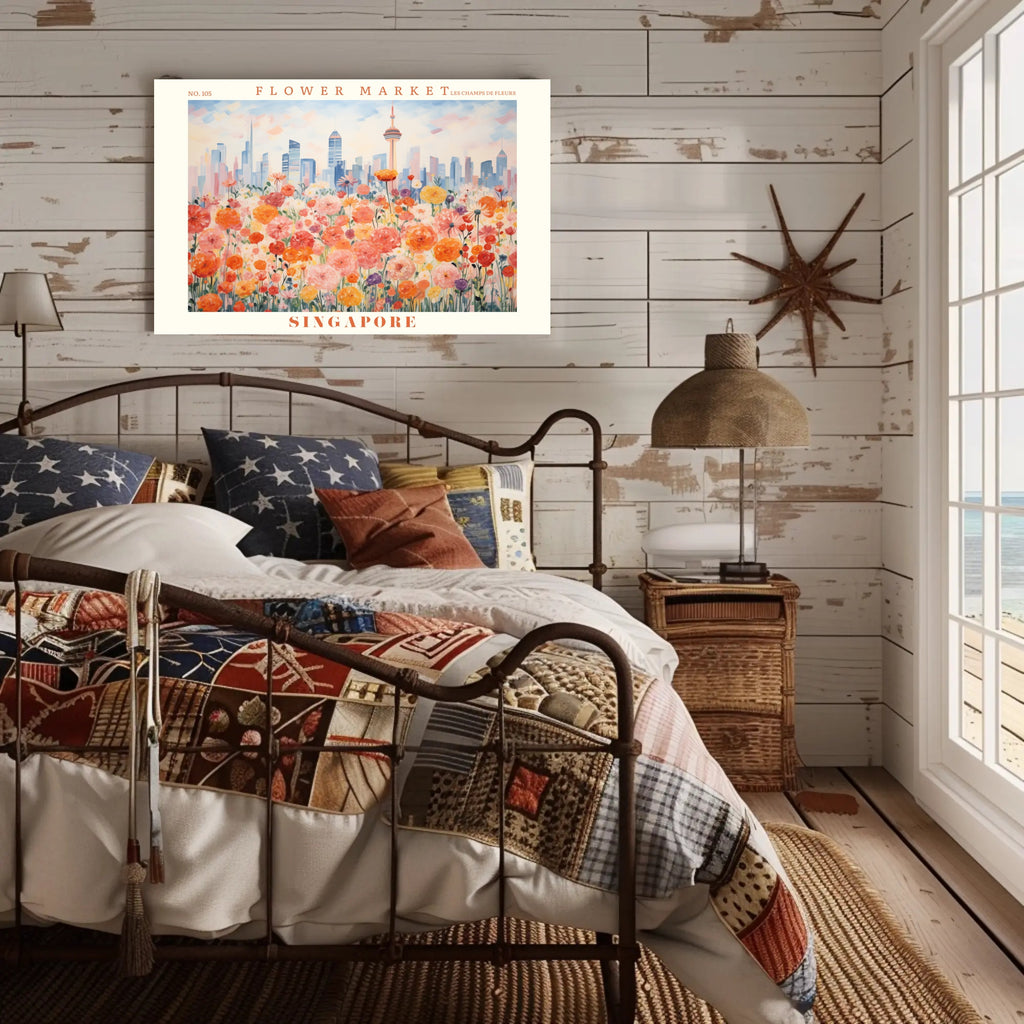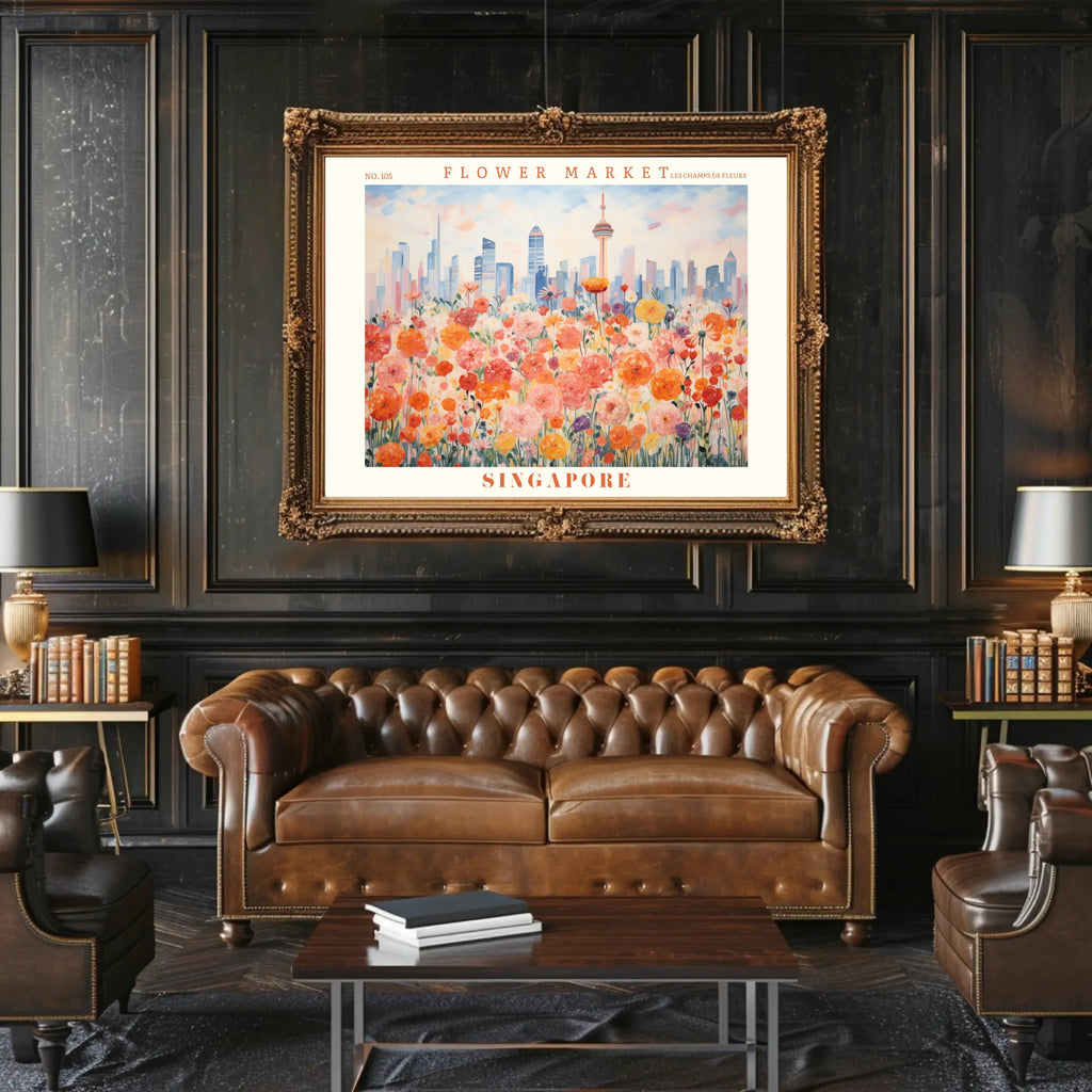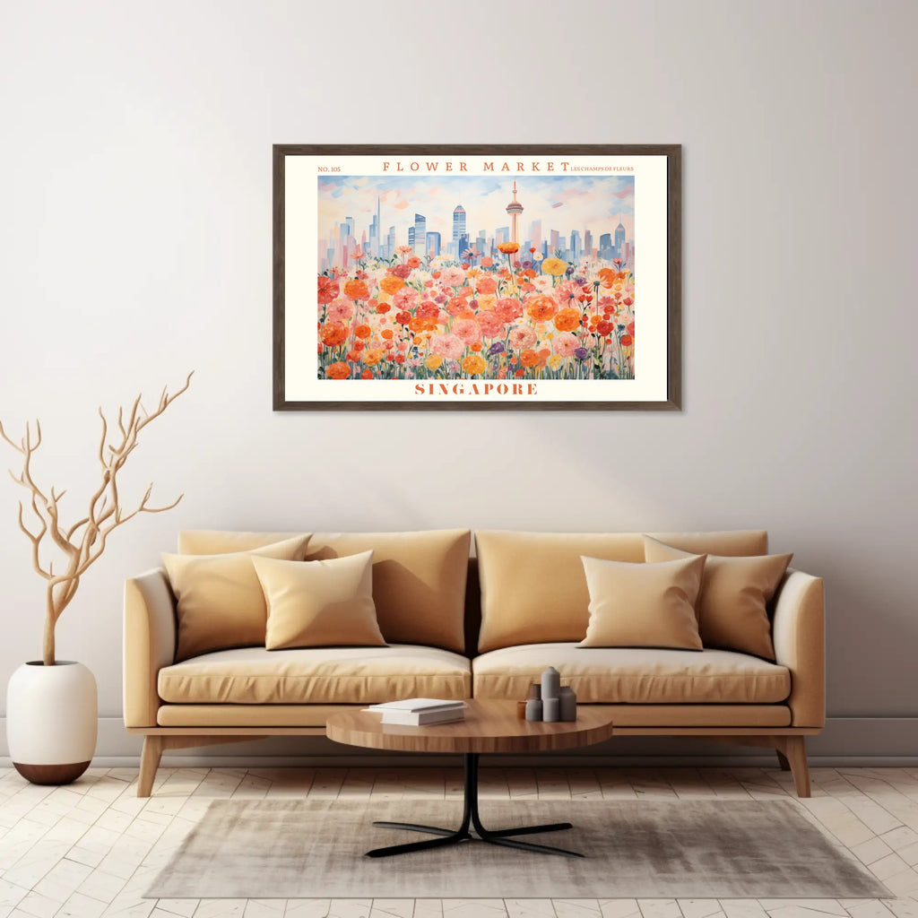 Immerse yourself in the vibrant world of Singapore's bustling flower market, where nature and modernity blend seamlessly. This striking poster showcases a colorful field of flowers in shades of pink, orange, yellow, and red against the backdrop of Singapore's iconic skyline. The loose, impressionist brushstrokes convey a sense of movement and life, capturing the cheerful and lively atmosphere of an urban oasis. With its unique blend of modern and impressionist styles, this artwork celebrates the harmonious coexistence of urban architecture and natural beauty, making it a perfect addition to any space seeking a touch of vibrant elegance.