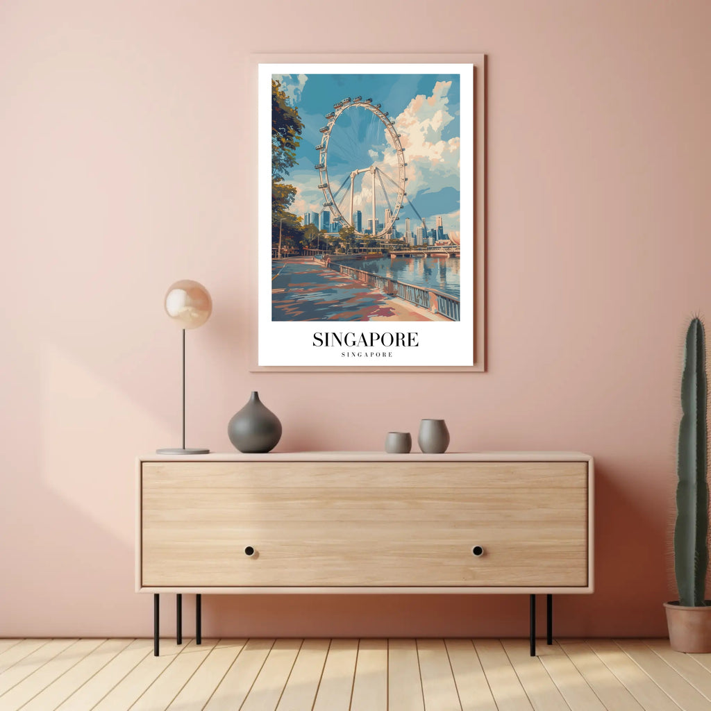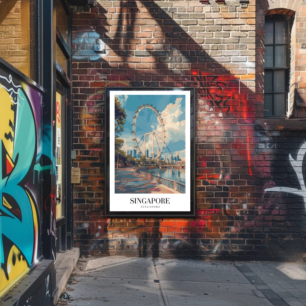 Bring the spirit of Singapore into your home with the "Singapore Flyer Cityscape: Iconic Urban Poster" from PosterGoat. This striking cityscape print captures the towering observation wheel rising above a reflective waterfront promenade and the sleek metropolitan skyline — an elegant celebration of modern architecture, travel, and urban life.