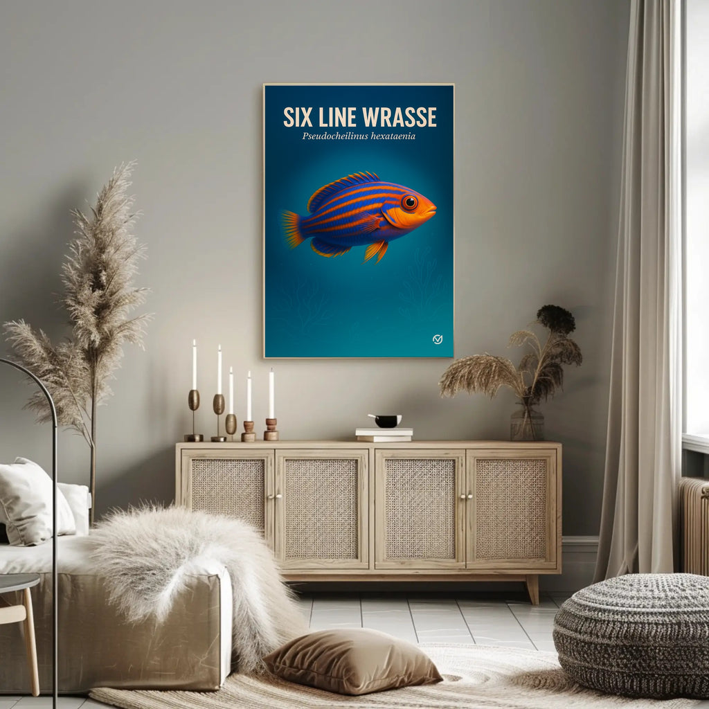 The Six Line Wrasse Poster by Your Brand delivers vibrant aquatic beauty for home decor enthusiasts. This stunning art print captures the essence of the Six Line Wrasse, making it an ideal choice for anyone looking to enhance their living space with a touch of marine charm.