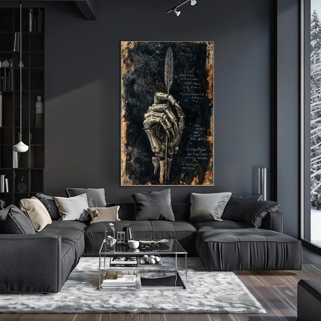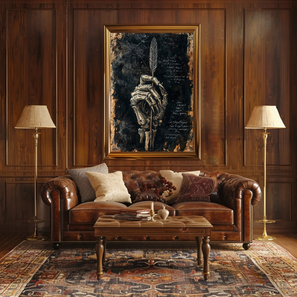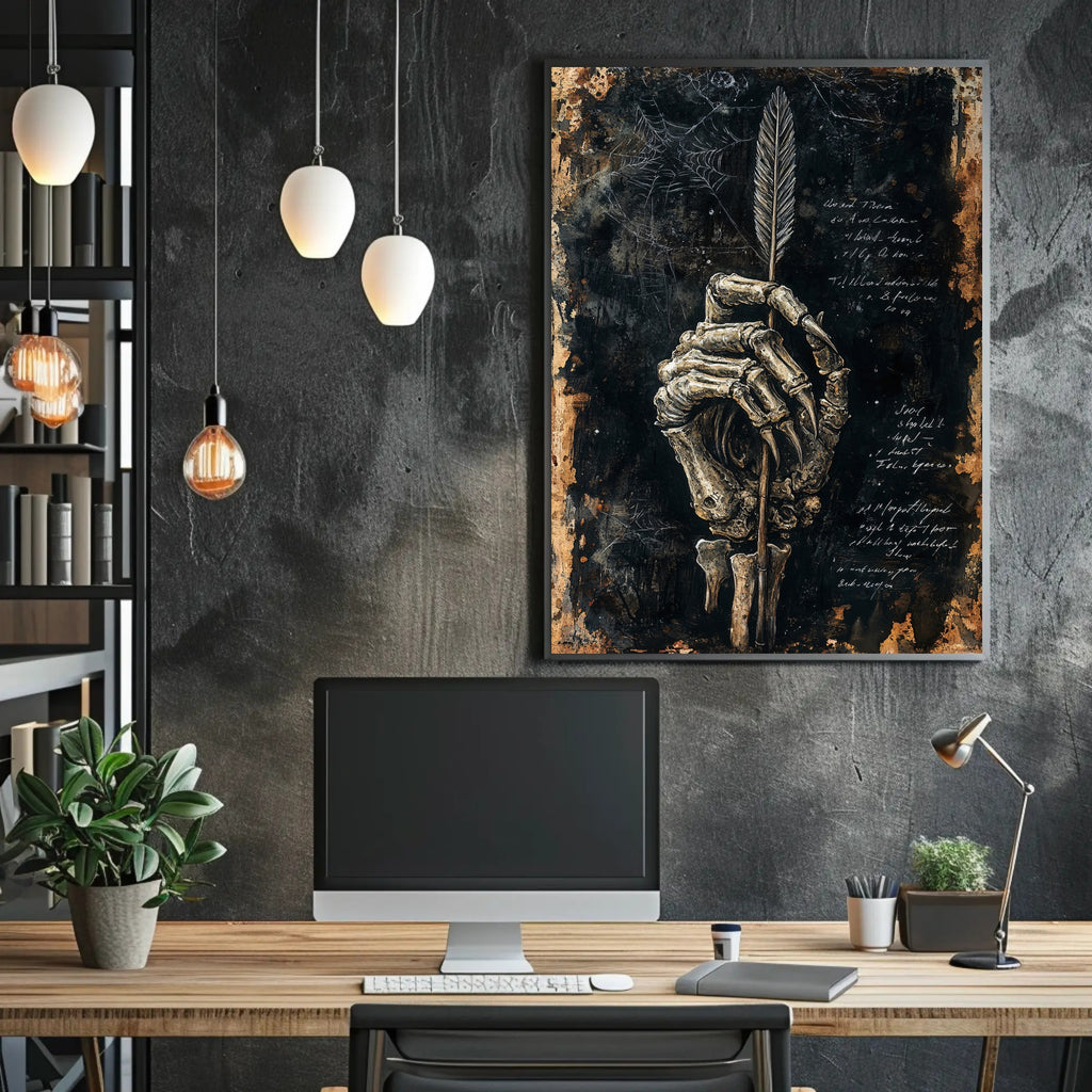 Bring dark elegance to your walls with the Skeletal Quill Poster from PosterGoat — a striking art print that blends macabre charm with minimalist, scenic-inspired composition. Richly textured brushwork reveals a weathered black-and-gold background, a detailed skeletal hand curled around an elegant feather quill, and faint spiderwebs and handwritten script that whisper of forgotten stories.