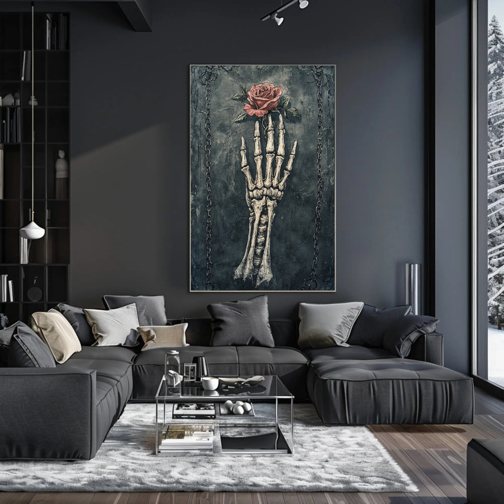PosterGoat's "Skeleton And Rose" poster blends macabre elegance with minimalist design—an arresting wall art piece that pairs a detailed skeletal hand with a single blooming rose against a textured, moody background. Perfect for art & aesthetic lovers, halloween decor, or anyone seeking a striking statement print for living rooms, bedrooms, or studio spaces.