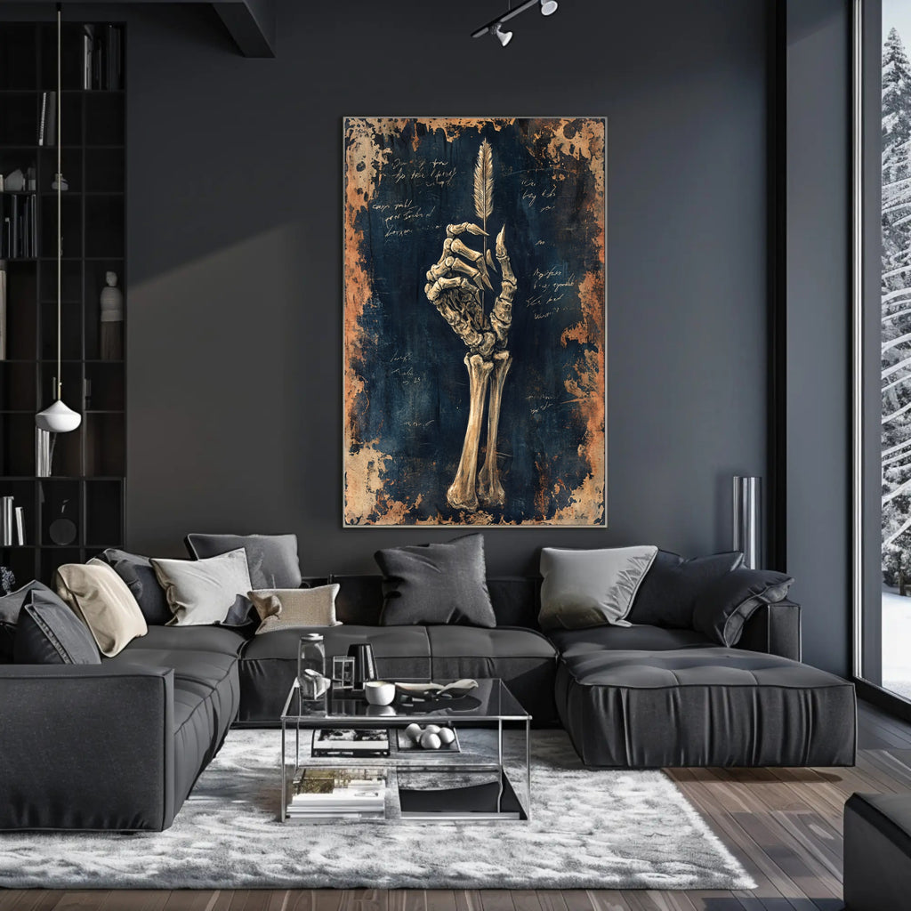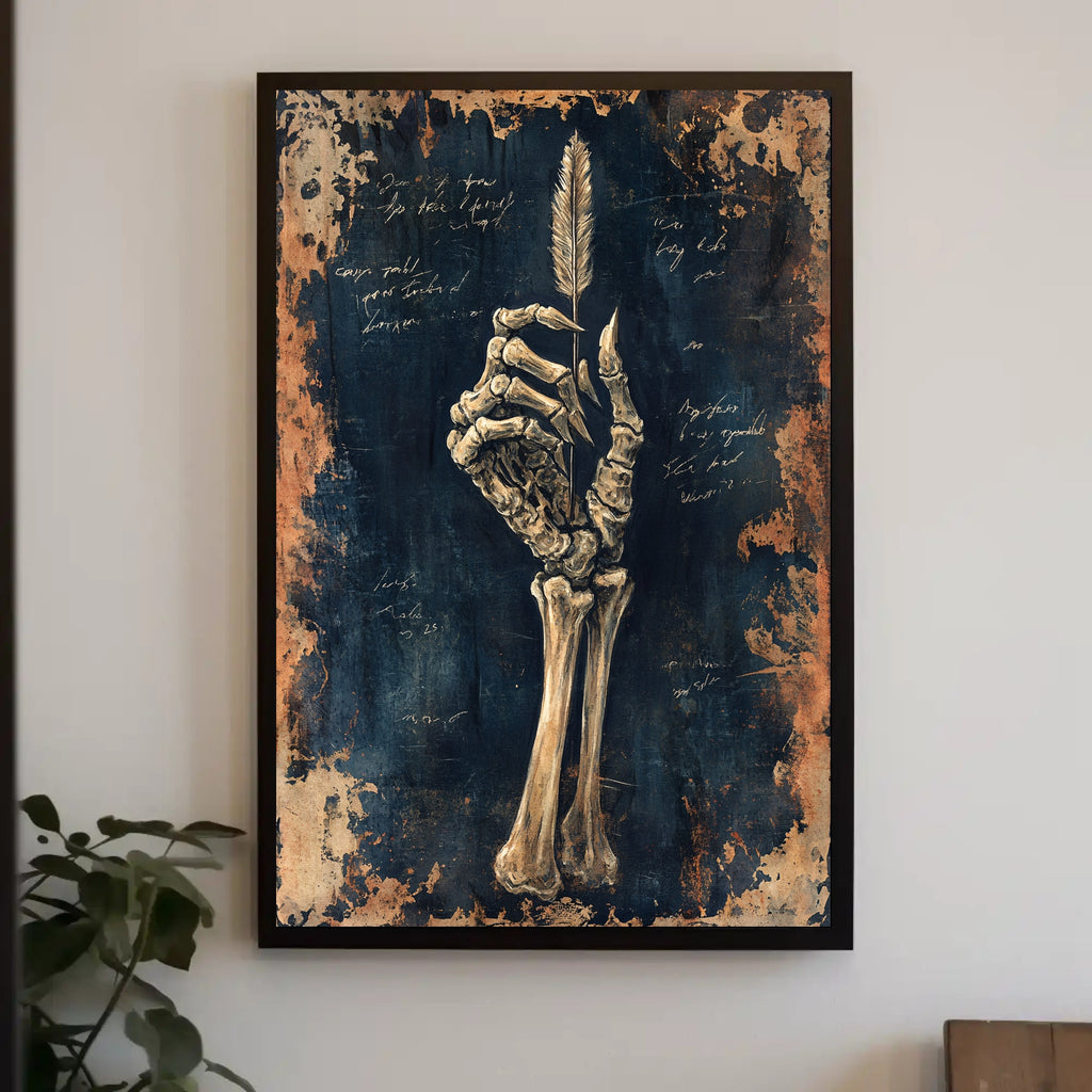 SkeletonS Quill Poster from PosterGoat — a striking 18x24 art poster that blends gothic allure with minimalist, vintage-inspired design. This evocative print features a skeletal hand delicately holding a quill against a deep indigo backdrop finished with distressed sepia edges and handwritten script accents, making it an instant focal point for modern, bohemian, or Halloween-themed interiors.