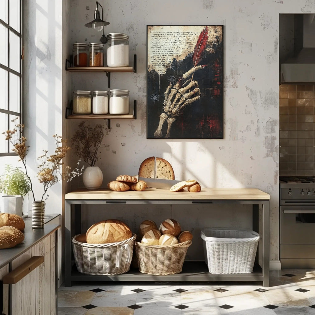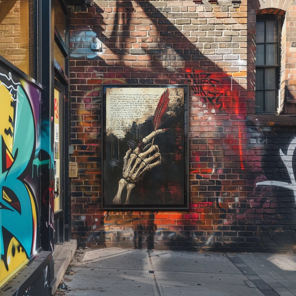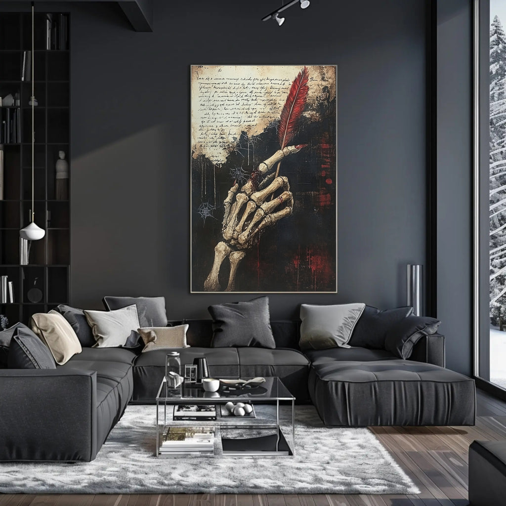 Bring a bold, haunting focal point to your walls with the SkeletonS Quill Poster from PosterGoat — a striking art print that blends gothic storytelling with minimalist, scenic composition. The composition centers on a weathered skeletal hand delicately gripping a blood-tipped red quill, set against a textured dark background layered with aged script and delicate spiderweb details. This poster turns any room into an evocative vignette of mystery and style.