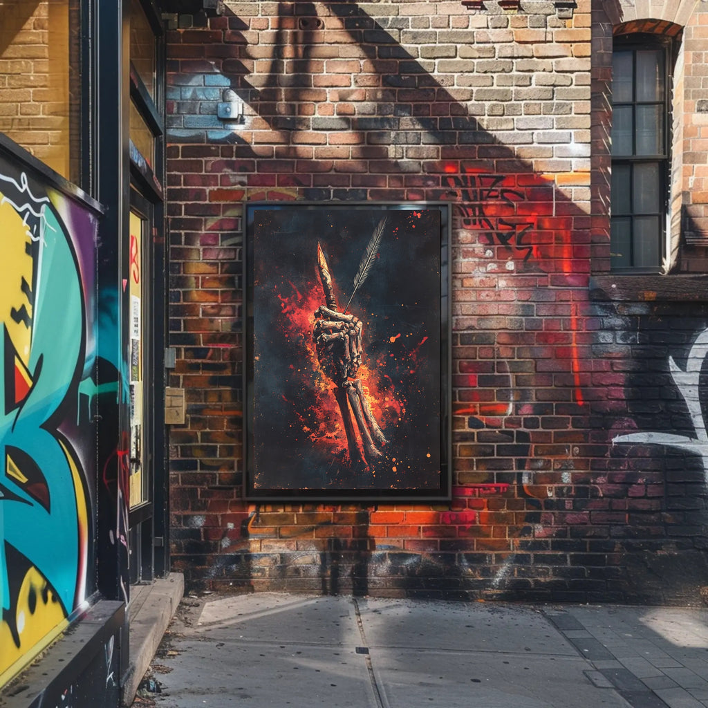 SkeletonS Quill Poster by PosterGoat brings a bold, minimalist statement to your walls — a skeletal hand clutching a quill and blade set against a stormy, charcoal backdrop with explosive orange and red splatters that evoke both fire and ink. This striking poster blends Halloween-inspired macabre with scenic, artful composition to create an arresting focal point for any room.
