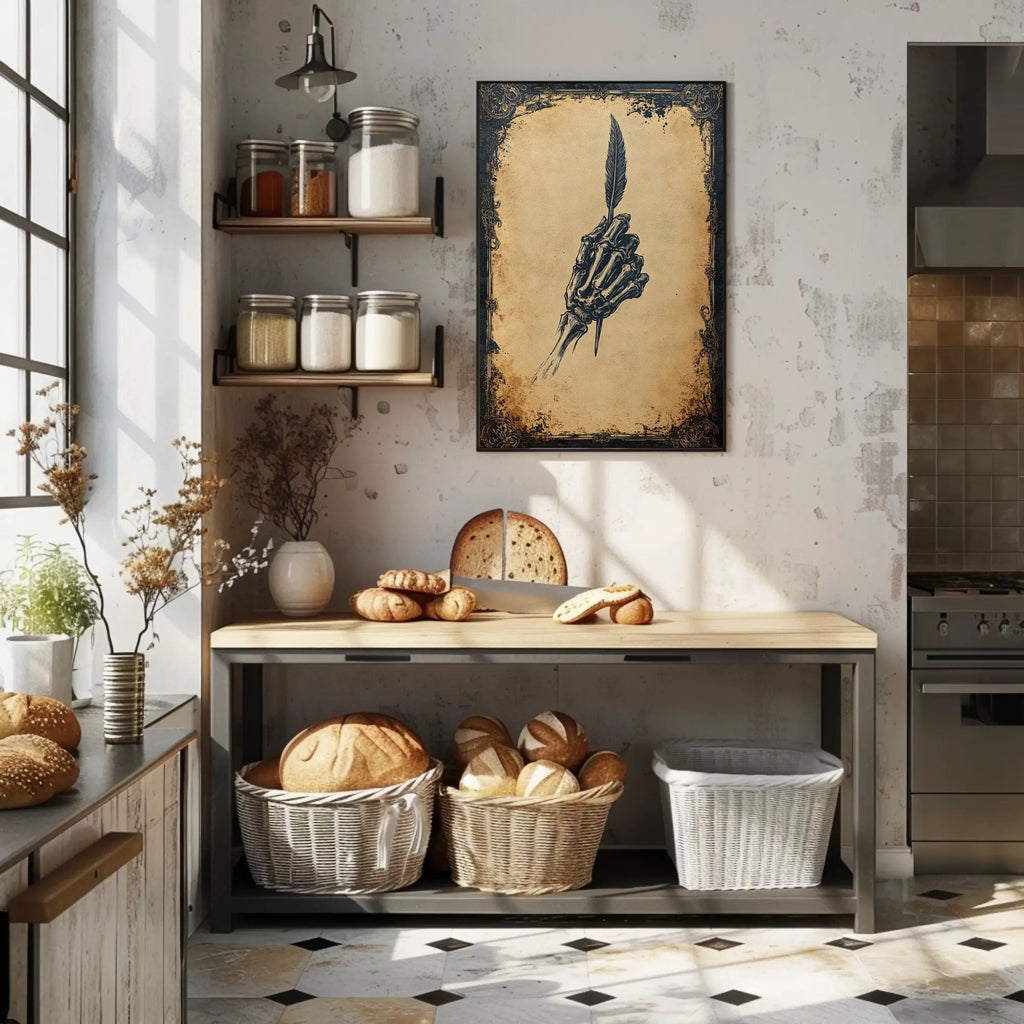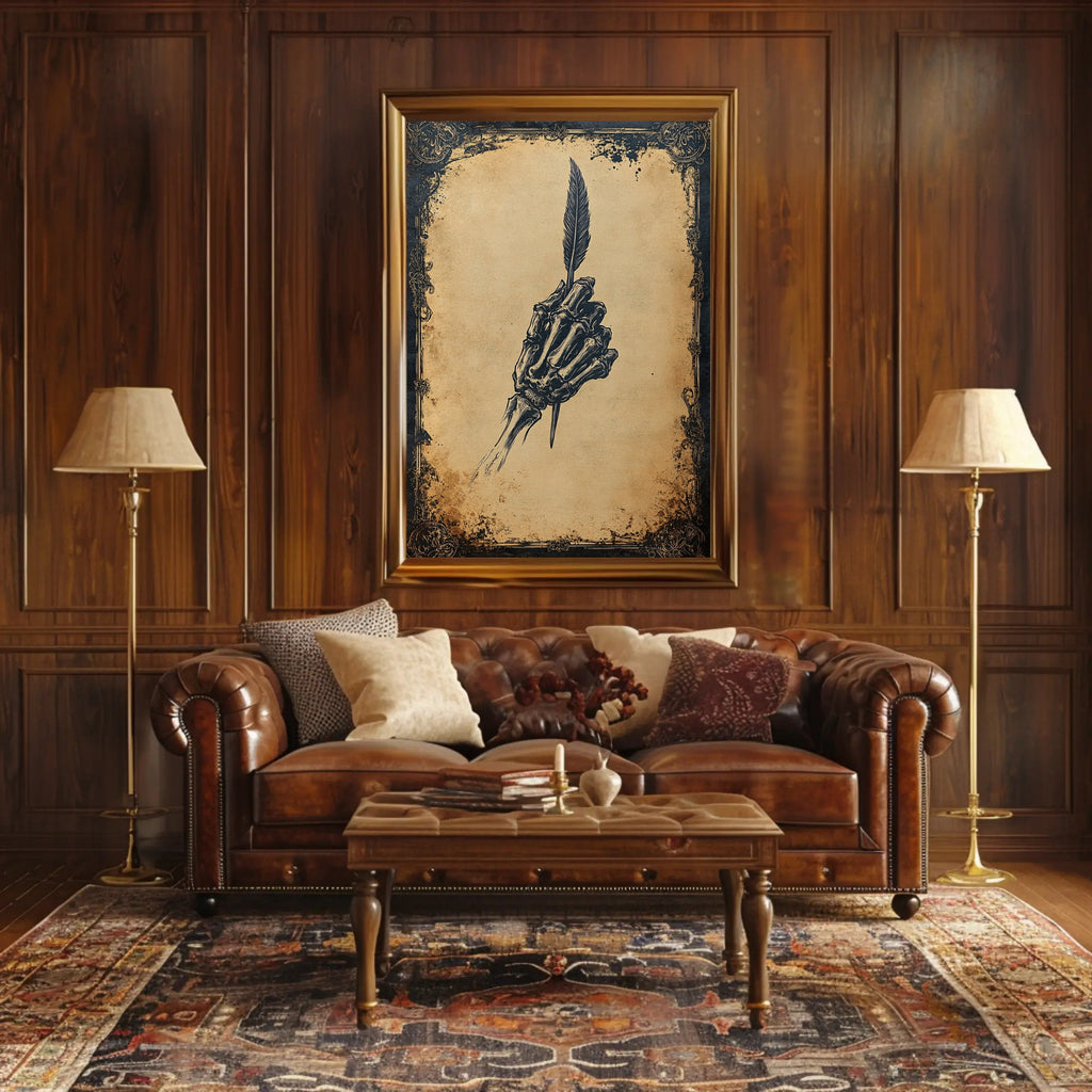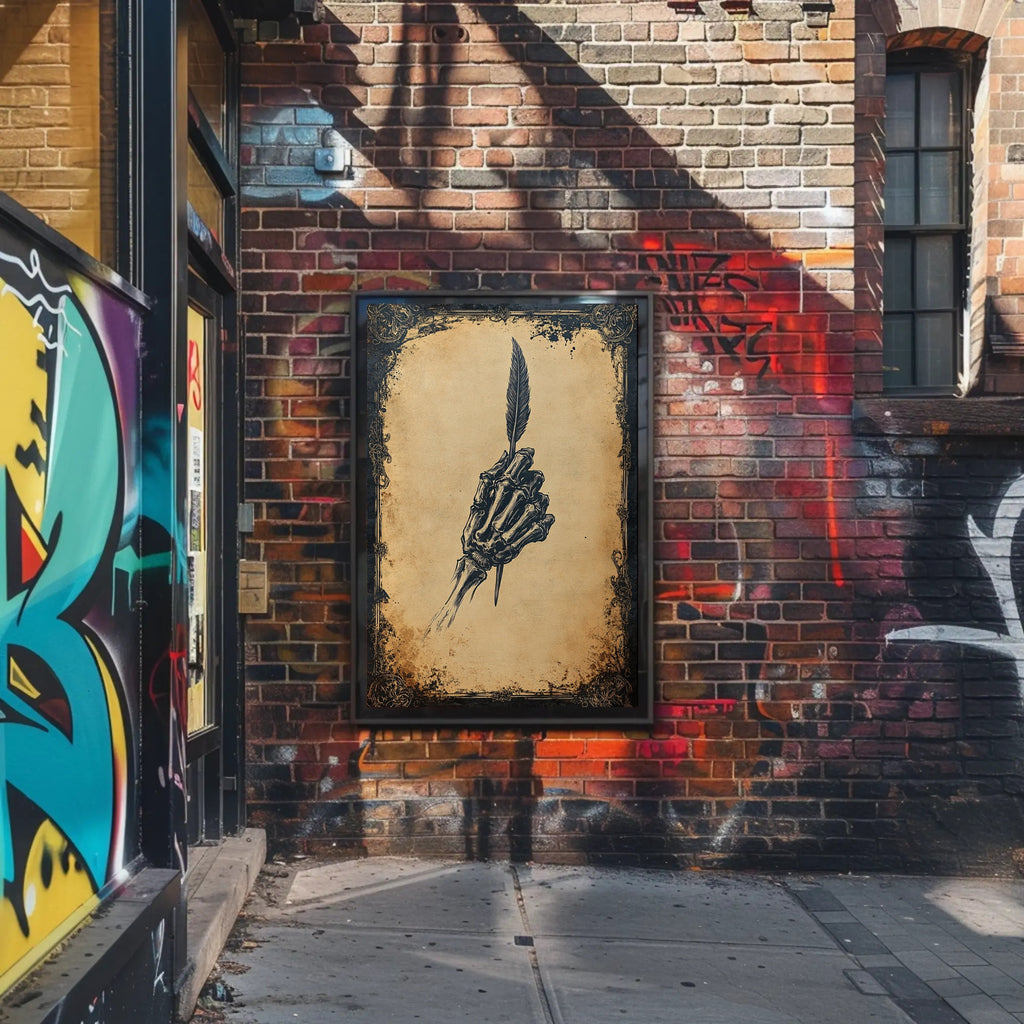 SkeletonS Quill Poster from PosterGoat brings a hauntingly elegant focal point to any wall — a detailed skeletal hand clutching a delicate quill against a distressed parchment backdrop that blends vintage charm with minimalist, gothic style.