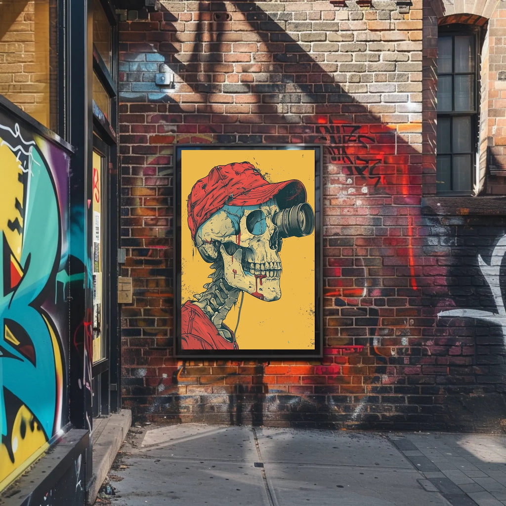 Transform any room into an instant conversation starter with the Skull with Lens Poster from PosterGoat — a bold Pop Art print that blends macabre charm with photography-inspired flair. This striking artwork features a cracked skull wearing a worn cap, the right eye replaced by a camera lens, and vivid splashes of red and blue against a warm yellow backdrop for maximum visual impact.