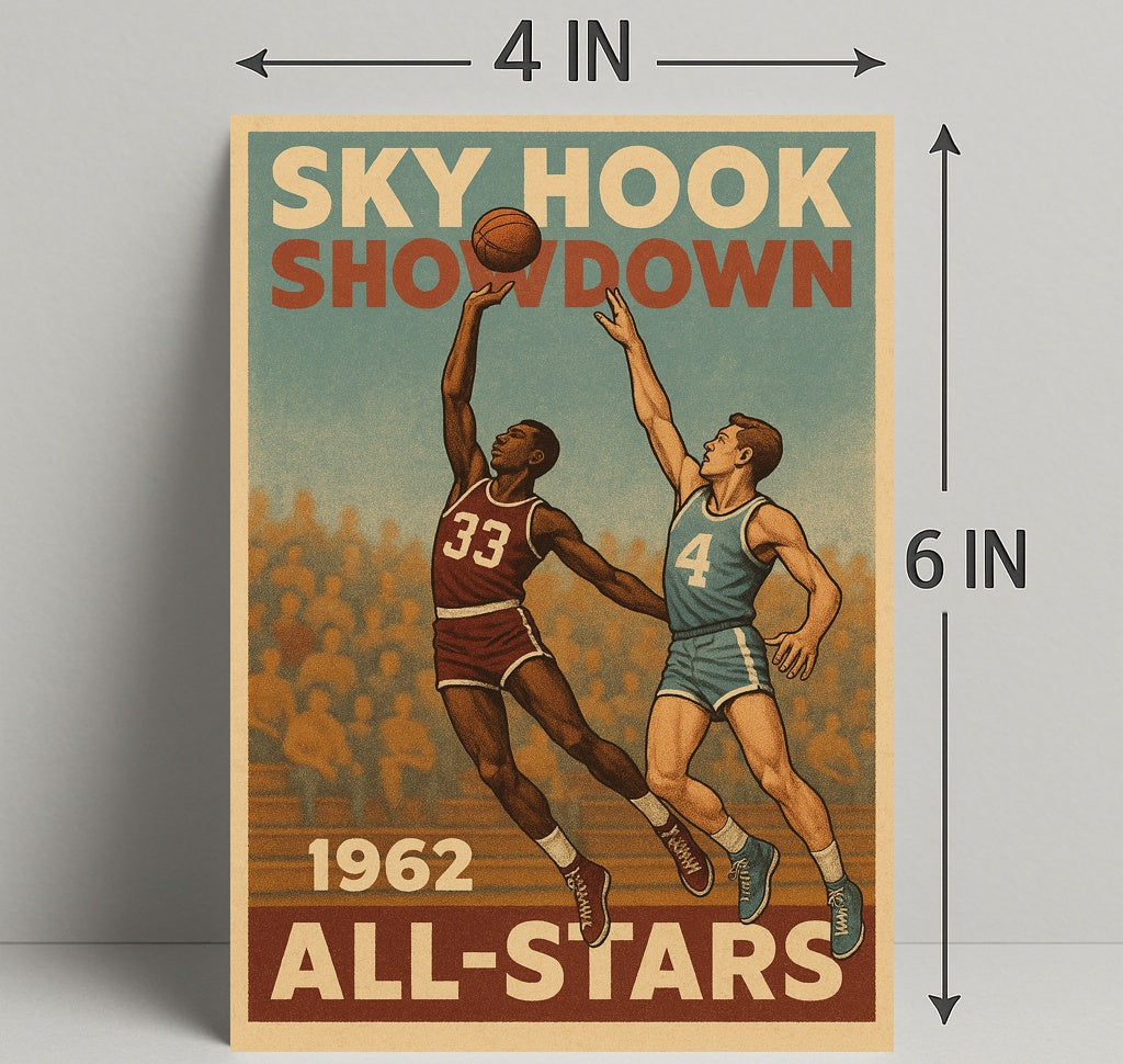 Don't miss the chance to own a piece of basketball history. Elevate your space with the "Sky Hook Showdown" poster and celebrate the legacy of classic basketball. Order yours today!
