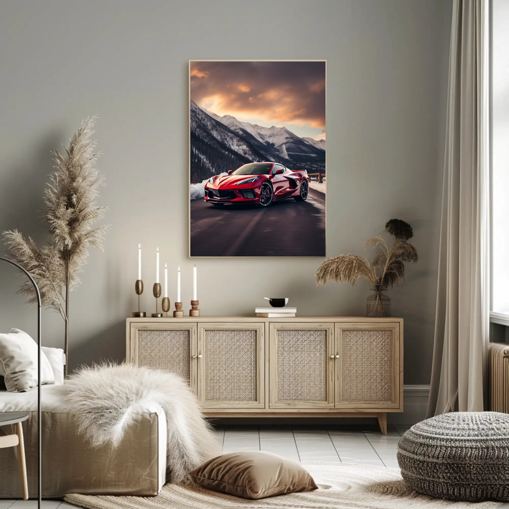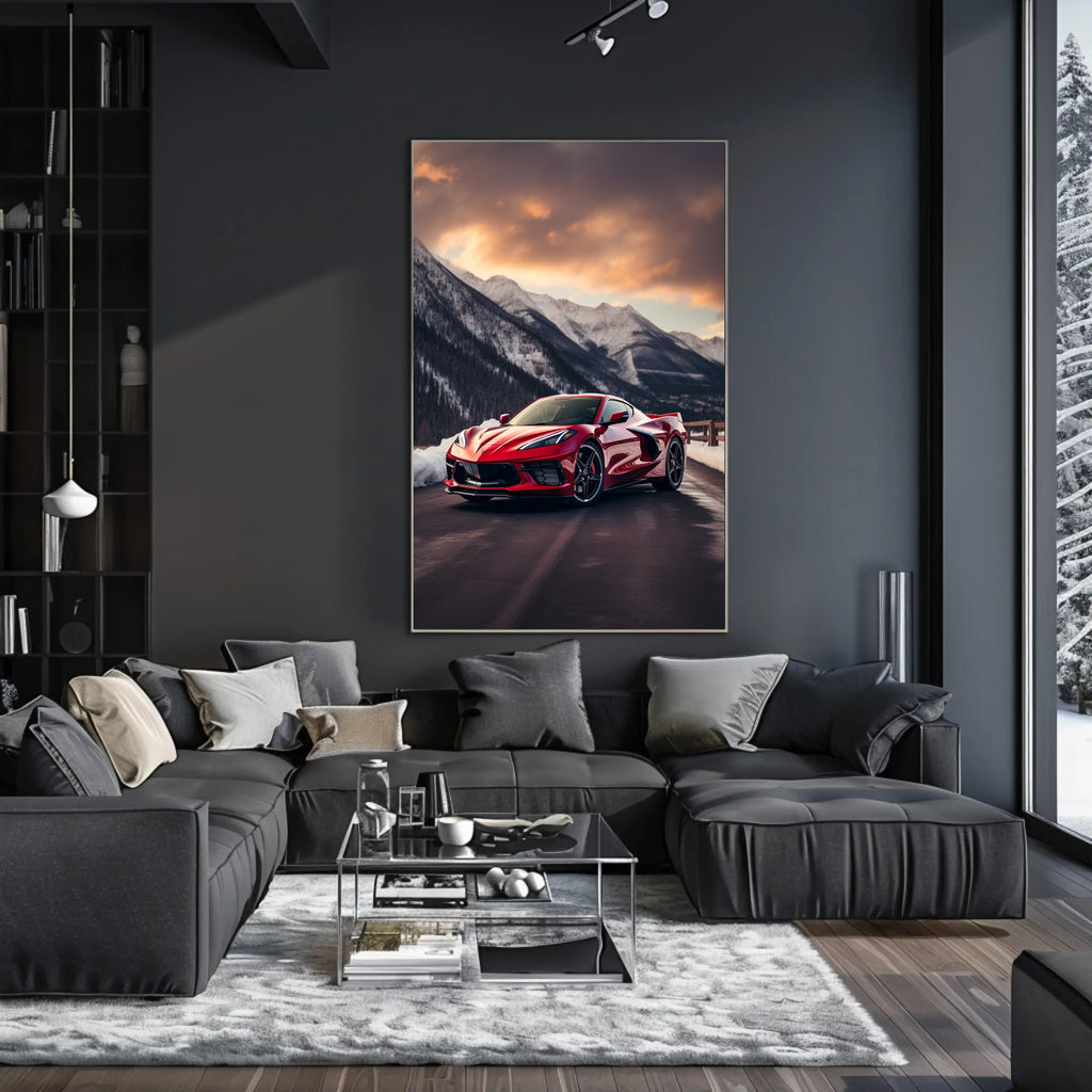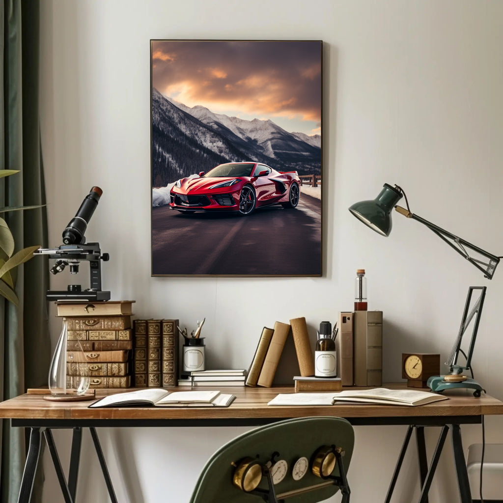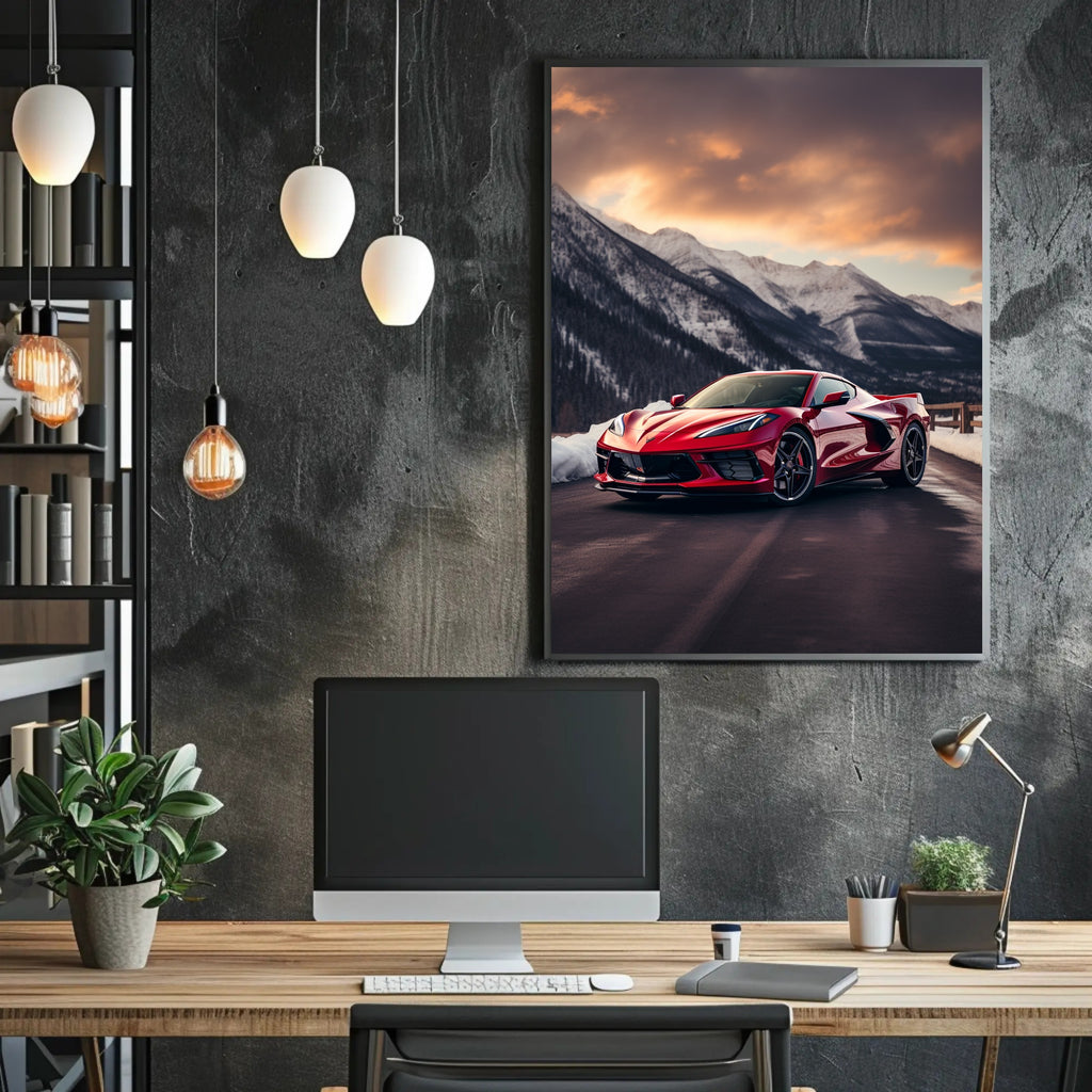 Bring high-performance style and serene winter scenery into your space with the "Sleek Performance in a Winter Wonderland Poster" from PosterGoat. This striking automotive print pairs a glossy sports car silhouette with sweeping snow-covered mountains and a dramatic sunset sky — a perfect centerpiece for car enthusiasts, decor lovers, and anyone craving a bold focal point in their home or office.