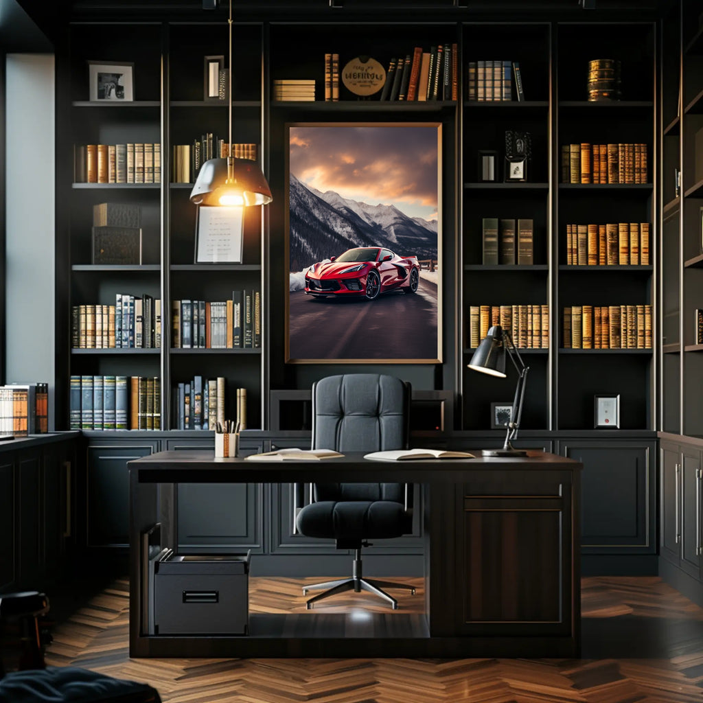 Whether displayed in a living room, garage lounge, or studio, this poster commands attention and elevates your decor with a blend of performance and peaceful winter scenery. Add the Sleek Performance in a Winter Wonderland Poster by PosterGoat to your collection today and transform any wall into a statement of style and speed.