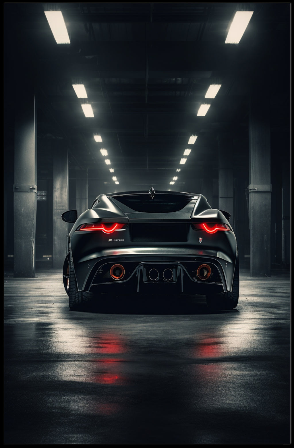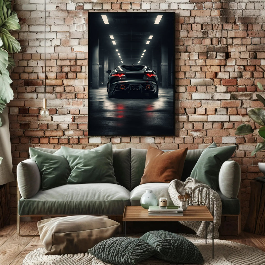 Perfect for home & garden décor, this poster blends minimalist styling with scenic, powerful visuals to deliver a stylish print that complements contemporary interiors. The composition highlights glossy reflections on the floor, bold red taillights, and a strong central perspective that draws the eye — ideal for garages, living rooms, offices, or man-caves.