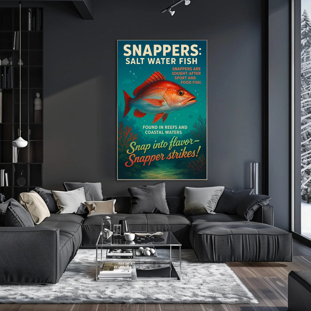 Bring the ocean home with the Snappers Salt Water Fish Poster from PosterGoat. This striking wall art features a richly detailed red snapper rendered against a deep teal sea—complete with coral silhouettes, rising bubbles and classic retro typography that gives the piece a timeless, travel-poster charm.