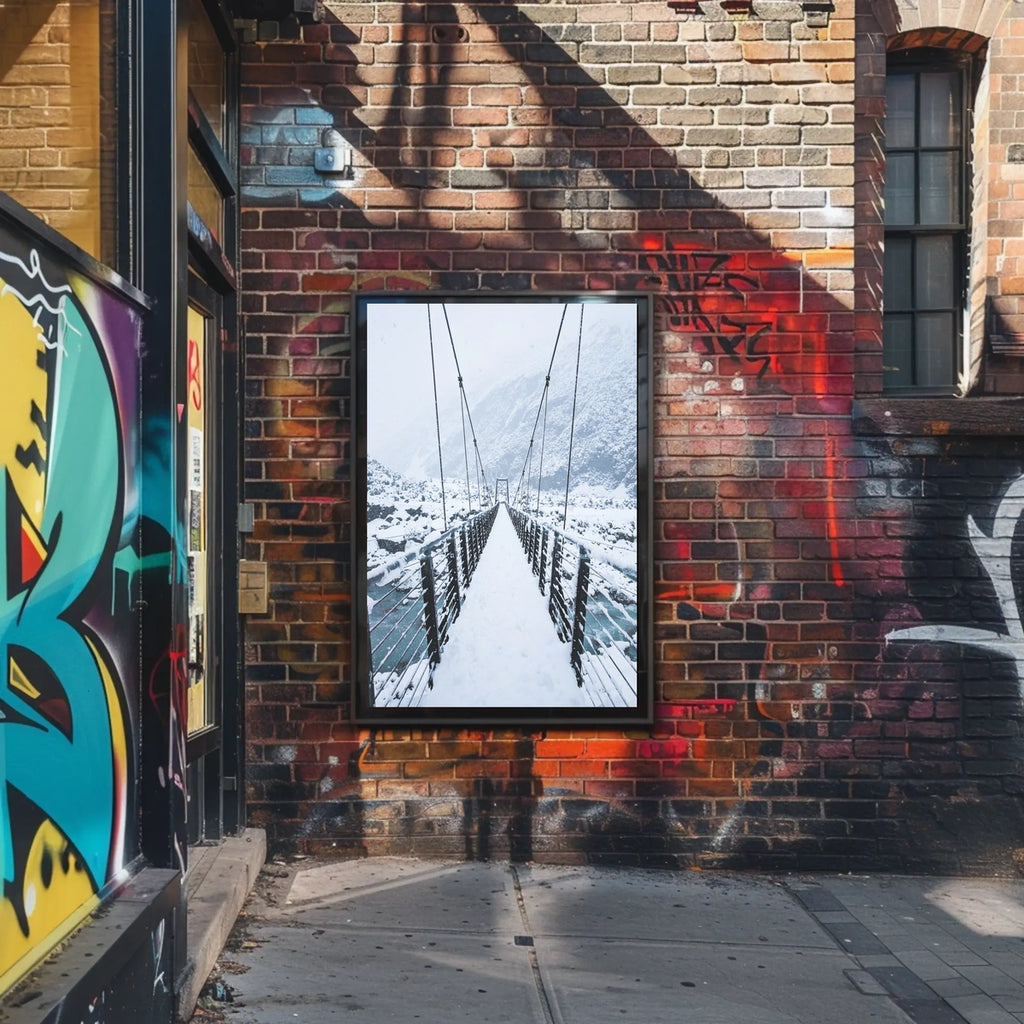 Discover the serene beauty of the Snow-Covered Bridge in Wintery Landscape National Park Poster. This photorealistic poster captures the essence of solitude and the untouched purity of nature, bringing a peaceful moment of winter into any space. The long suspension bridge, draped in snow and flanked by snow-laden rocks, stretches over a river with icy patches, guiding your eye toward the snow-capped mountains on the horizon. Perfect for nature lovers and anyone who appreciates peaceful isolation, this poster evokes a sense of calm and the majestic beauty of national parks in winter.
