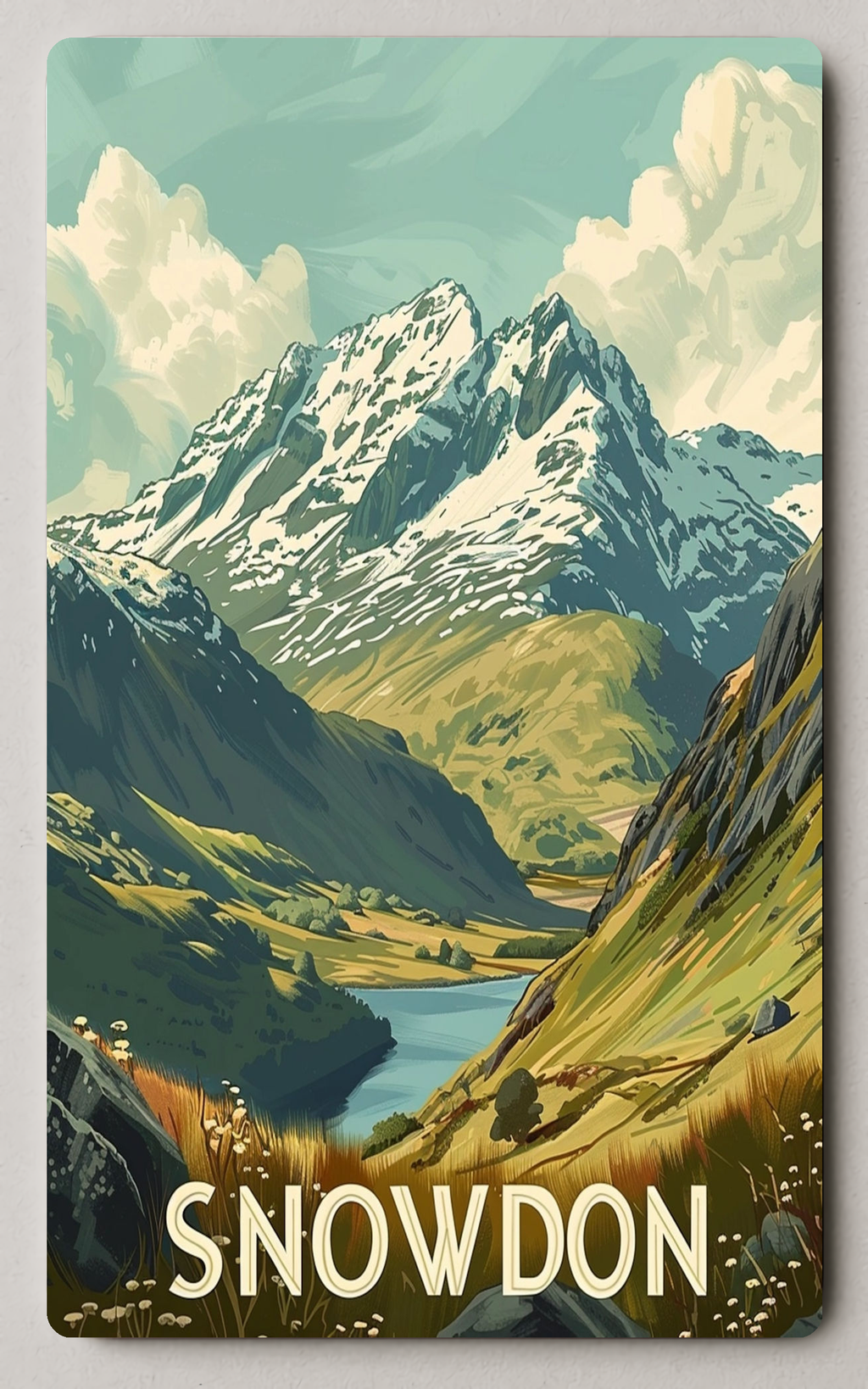 Snowdon Majestic Serenity Vintage Trading Card from PosterGoat captures the sweeping grandeur of Snowdon in a retro-inspired, collectible trading card format — a perfect fusion of landscape photography influence and vintage illustration for collectors and lovers of the outdoors.