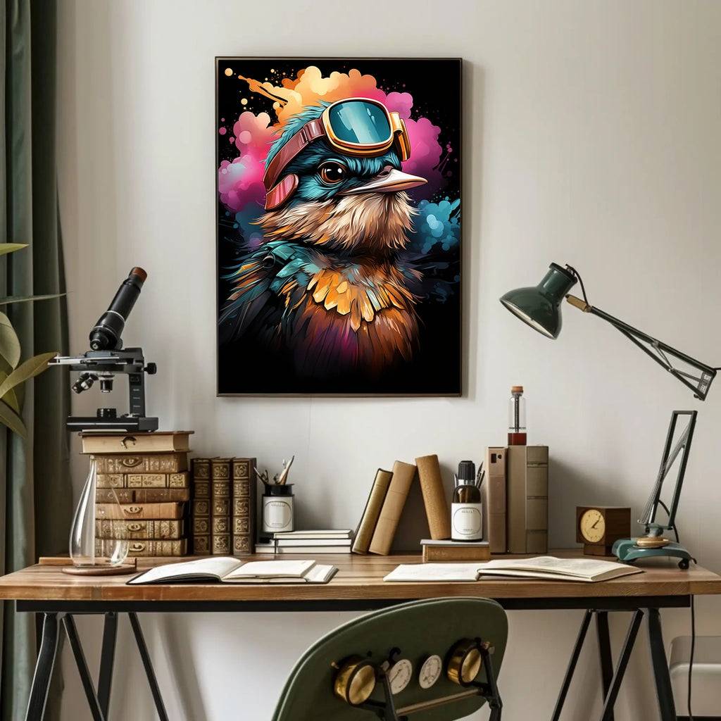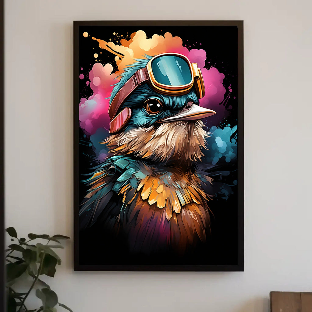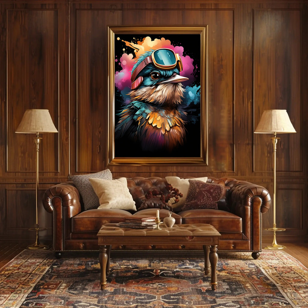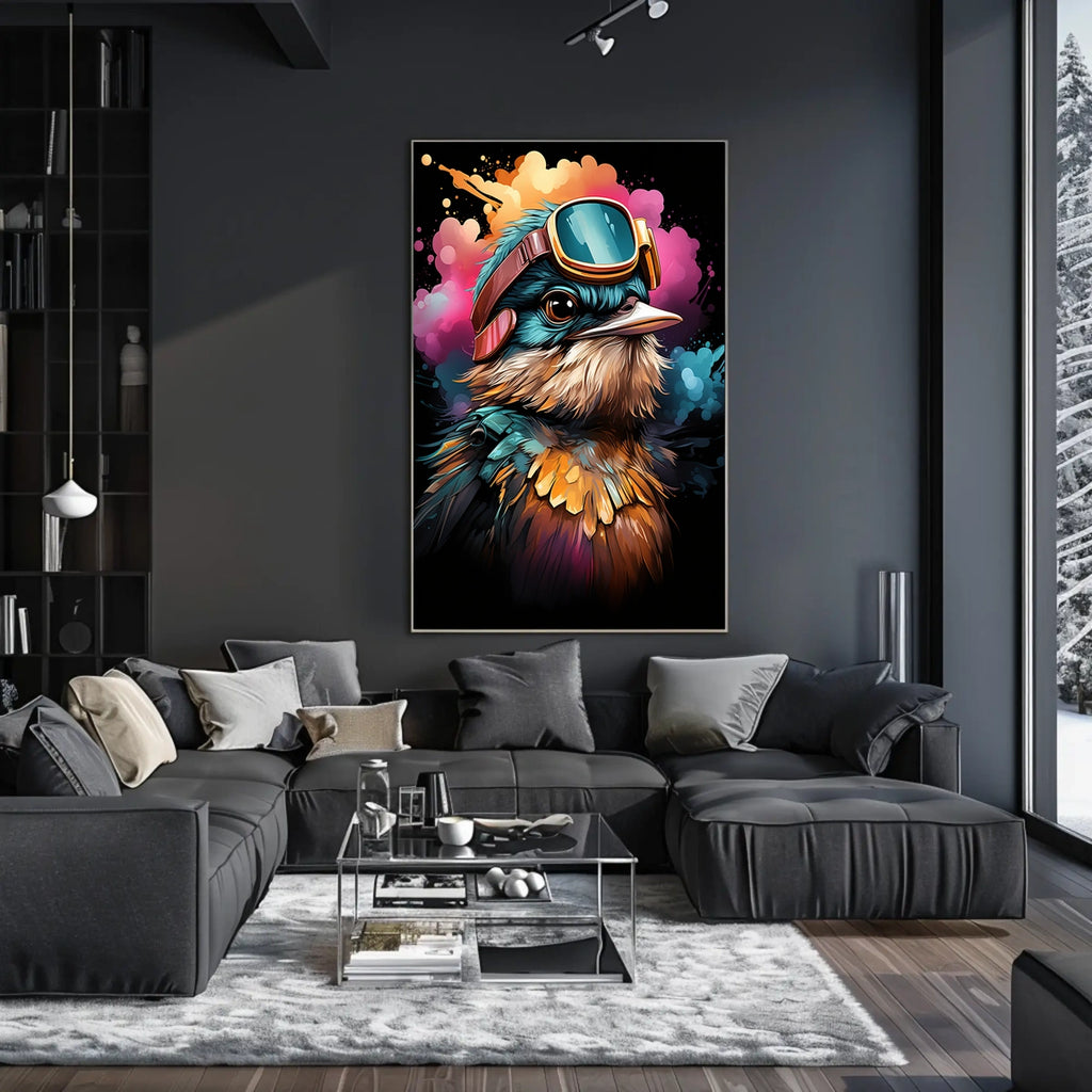 Intro: Dive into a world of vibrant imagination with Soaring in Style, a striking artwork that celebrates adventure. This piece features a bird wearing sleek goggles, set against a backdrop of colorful splashes, inviting you to embrace your inner explorer and express bold creativity in any room.