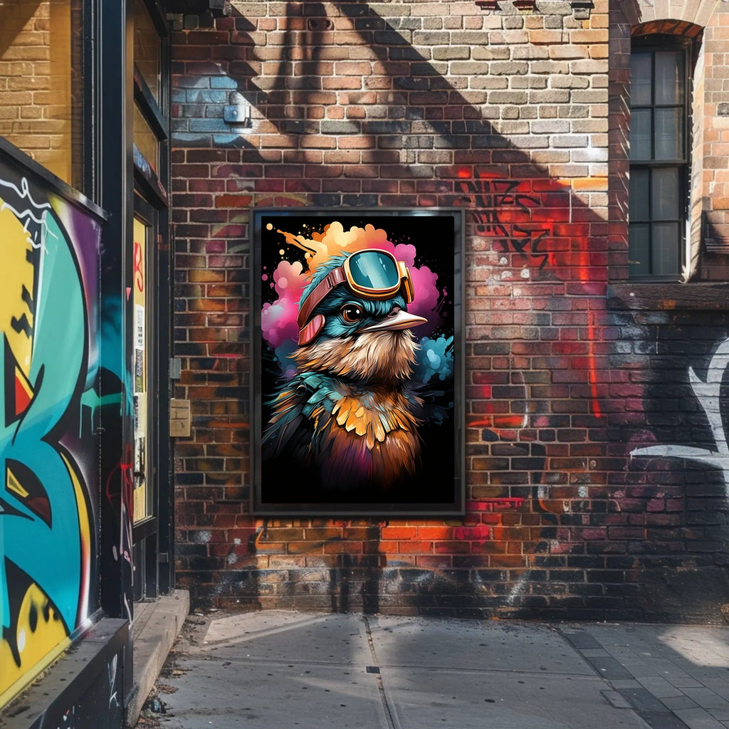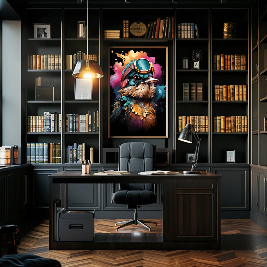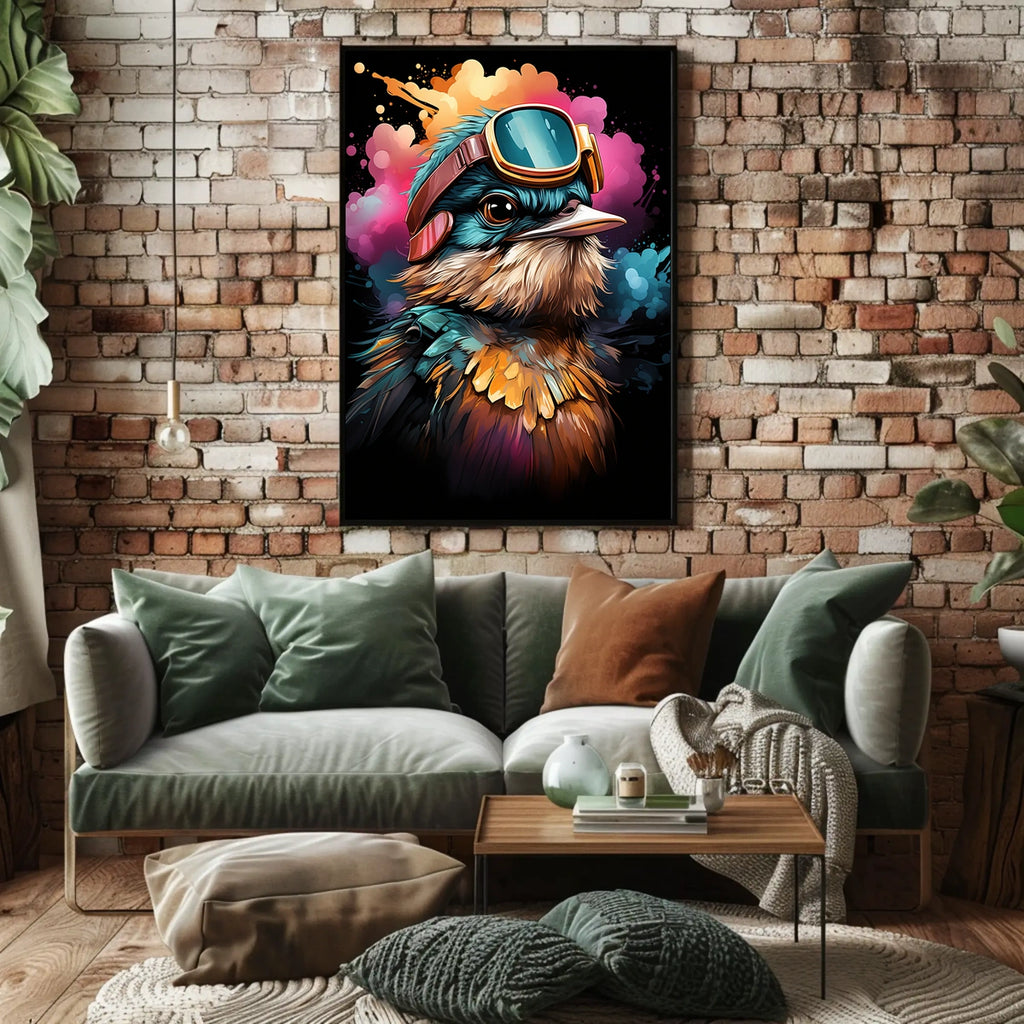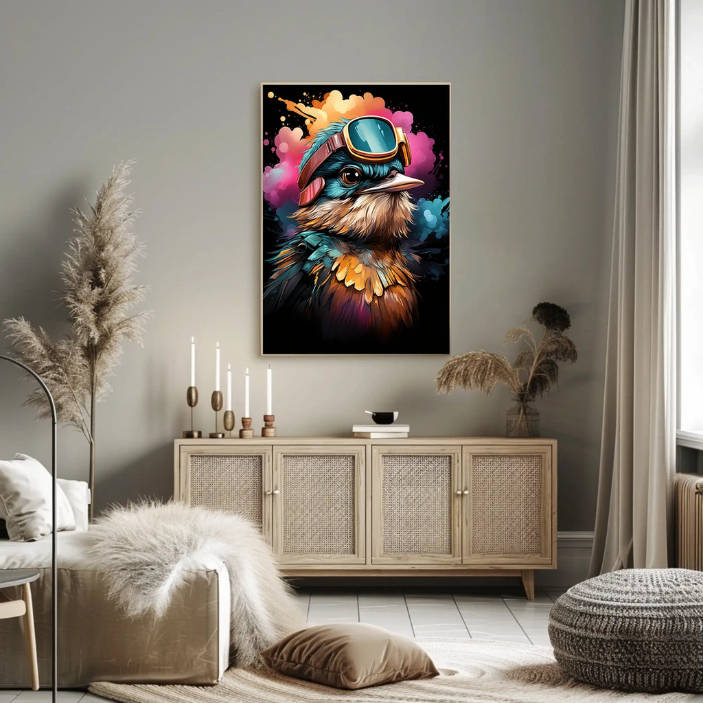 Intro: Dive into a world of vibrant imagination with Soaring in Style, a striking artwork that celebrates adventure. This piece features a bird wearing sleek goggles, set against a backdrop of colorful splashes, inviting you to embrace your inner explorer and express bold creativity in any room.