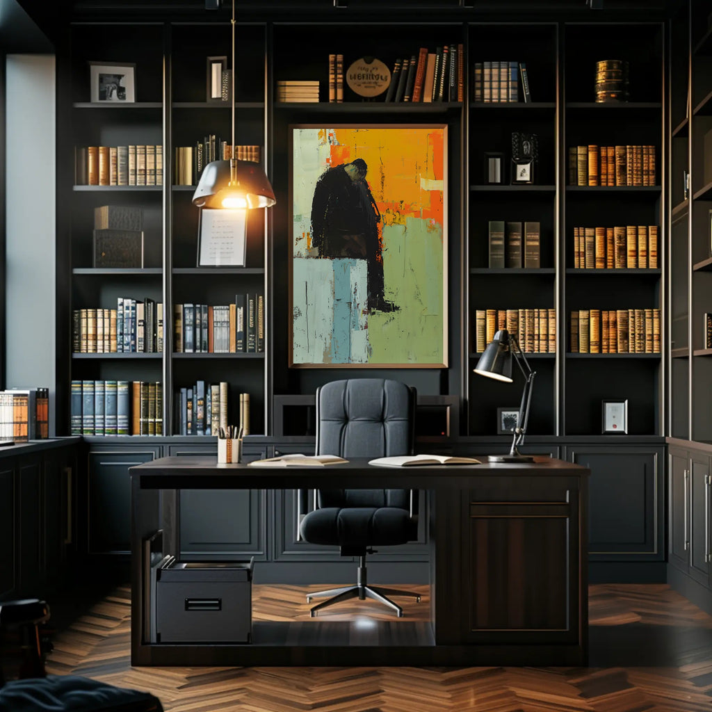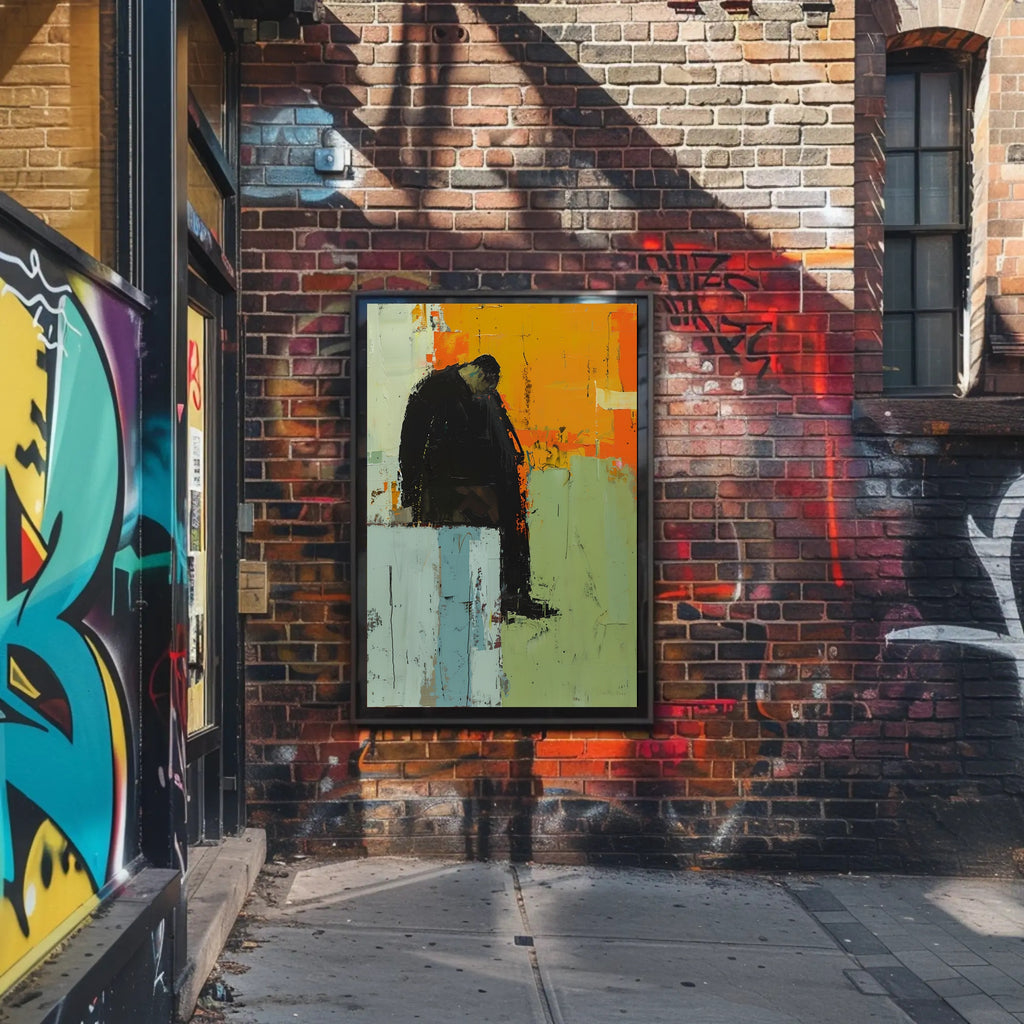 This striking abstract art poster embodies a somber and introspective essence through its vivid portrayal of a dark, indistinct human figure with a bowed head. The juxtaposition of warm oranges and cool pale greens in bold, textured color blocks creates a captivating contrast, enriching the depth of the figure's silhouette. Modern and abstract in style, the piece utilizes thick, expressive brush strokes and a rough texture, reminiscent of layered paint, which adds a tactile dimension. This artwork invites contemplation, embodying an emotional range that appeals to those who appreciate nuanced and thought-provoking visual narratives.