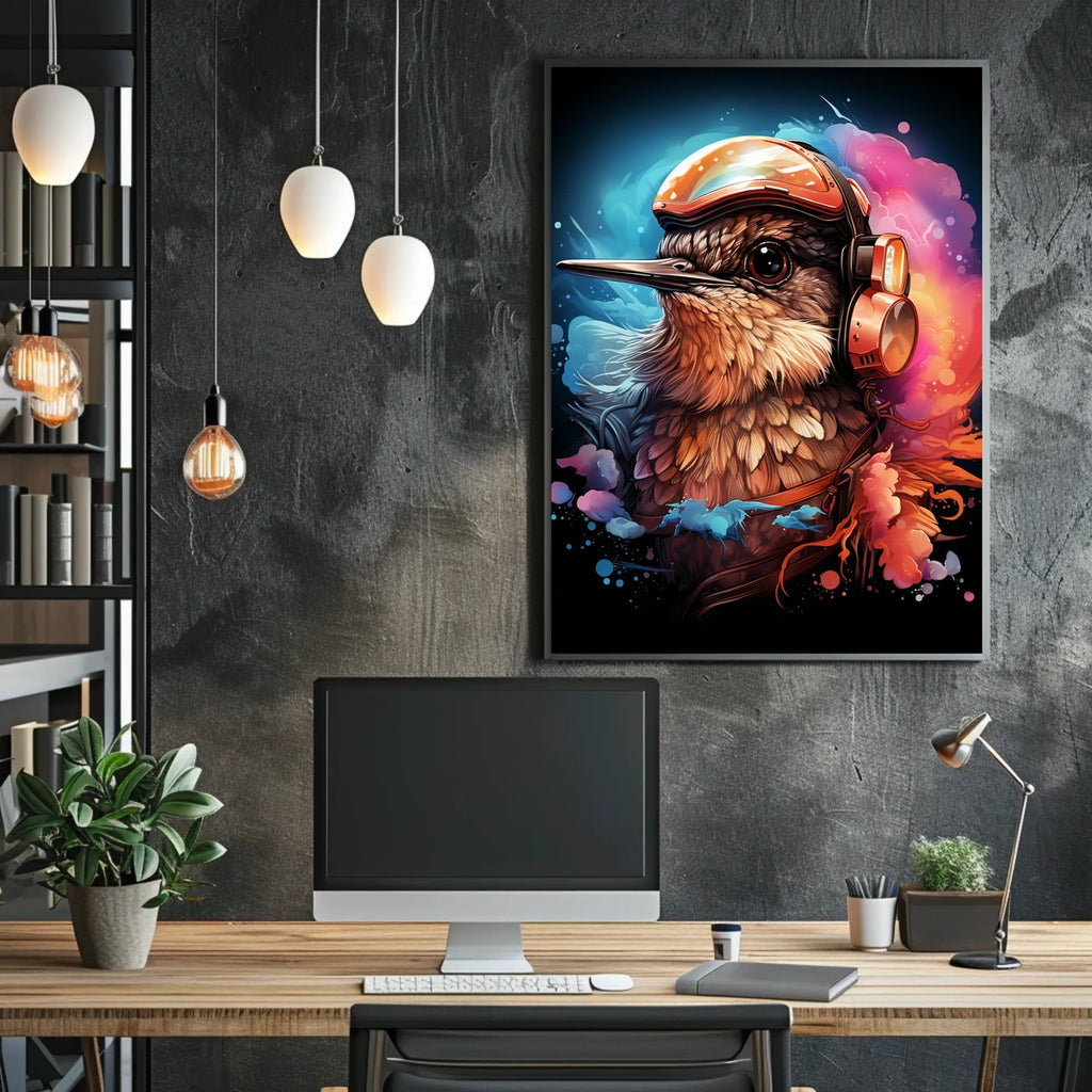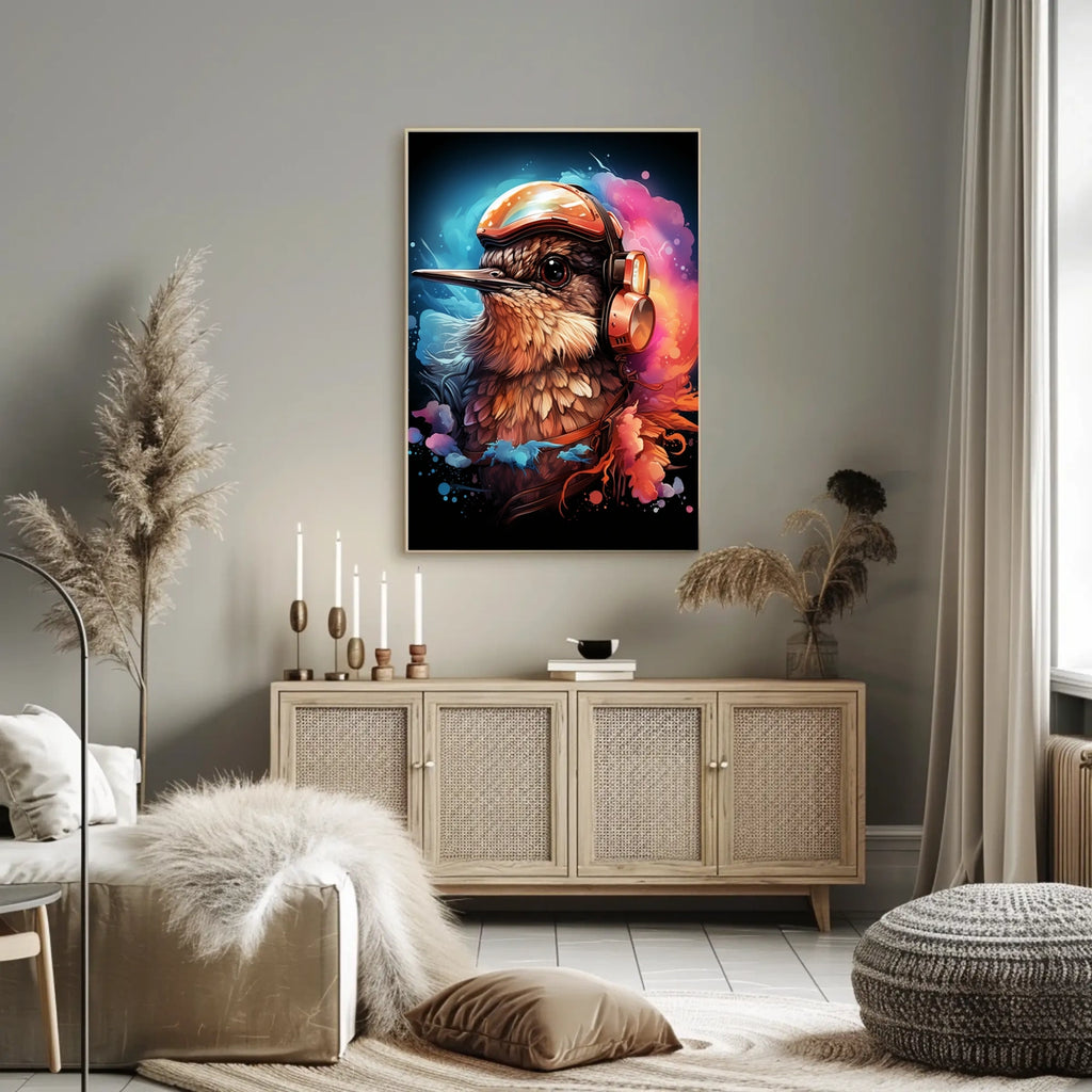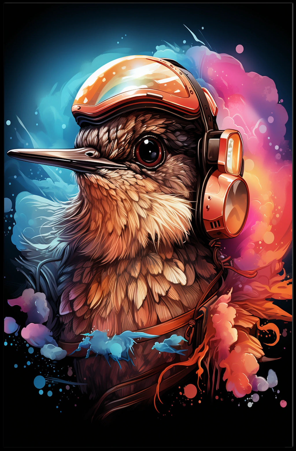 Experience the Sonic Aviator poster, where nature meets innovation in a vivid, music-inspired moment. A bird glides with futuristic headphones and a sleek visor, soaring through swirling, color-drenched clouds that energize any space.