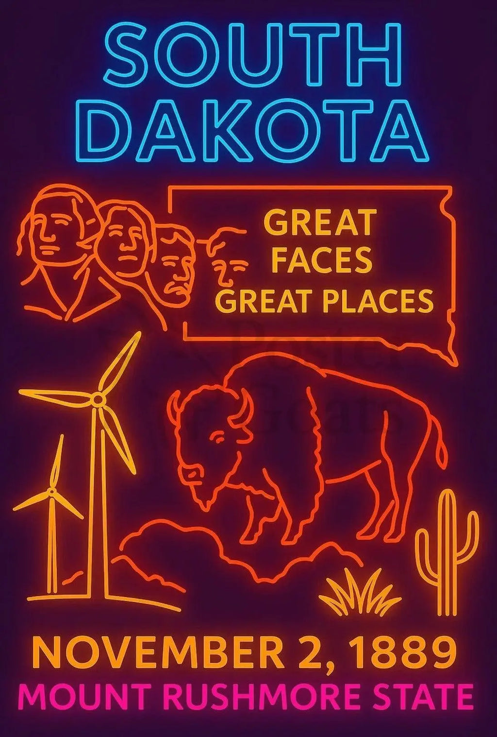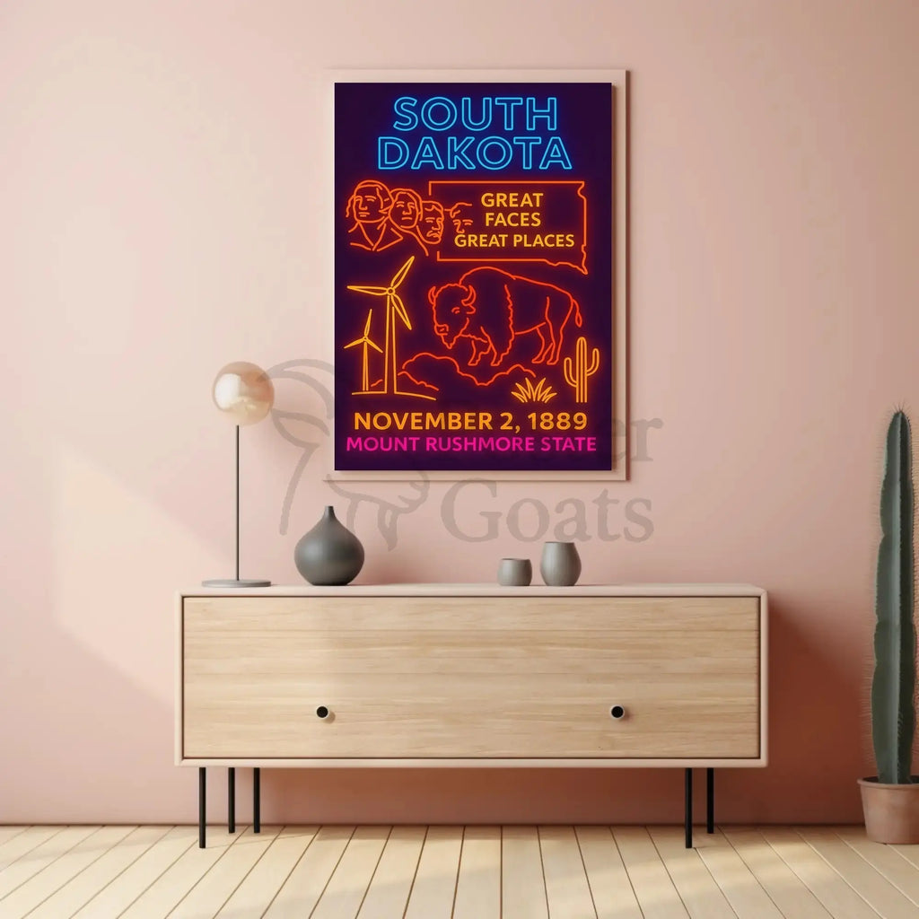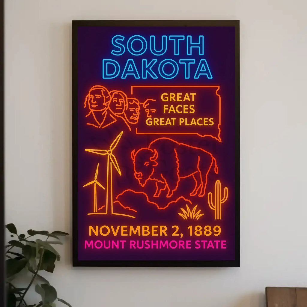 Bring South Dakota home: Add this striking PosterGoat print to your cart and elevate your space with retro neon energy—order now to make a vivid statement on your wall.