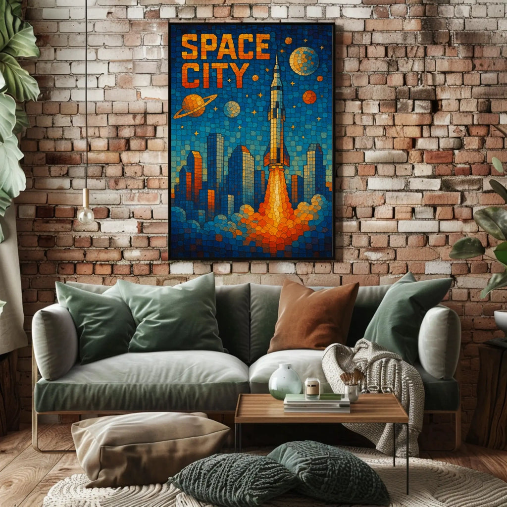 Immerse yourself in the cosmos with the Space City Adventure poster. This captivating artwork pairs a bold rocket launch with a starry sky, vibrant planets, and a sleek, futuristic cityscape—an ideal centerpiece for space lovers and dreamers who crave bold wall art that fuels imagination.
