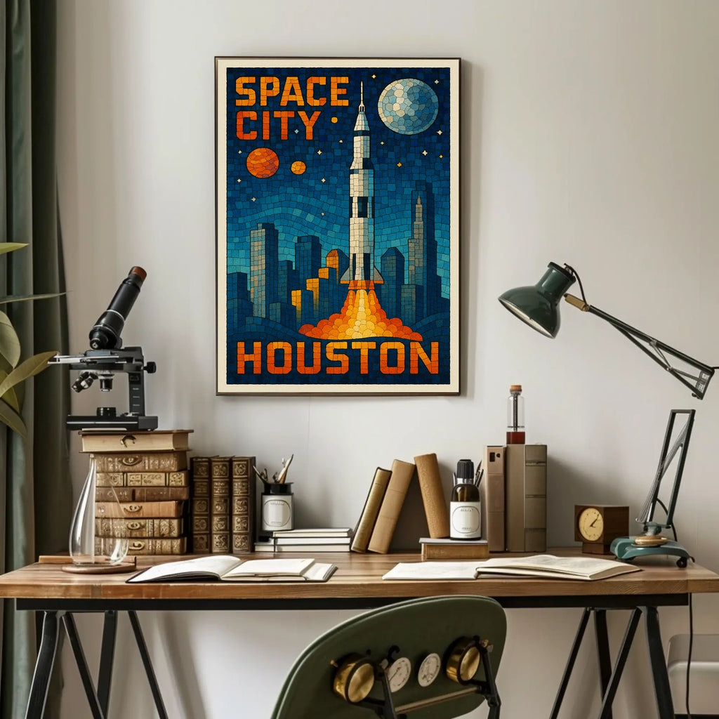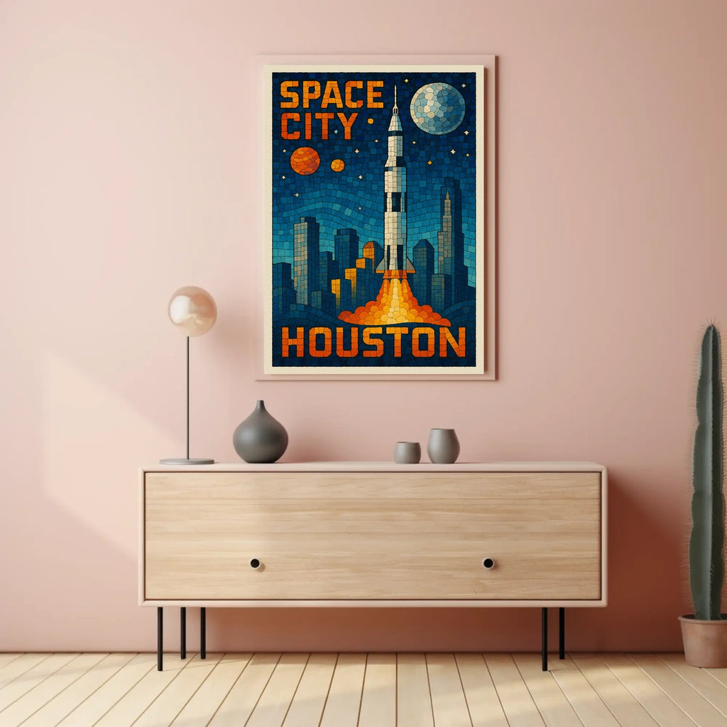 Bring a bold slice of Houston's space story into your home or office. This poster blends aerospace history with contemporary mosaic styling, offering a versatile decor piece for living rooms, study areas, or galleries. Add to cart now to celebrate exploration every day.