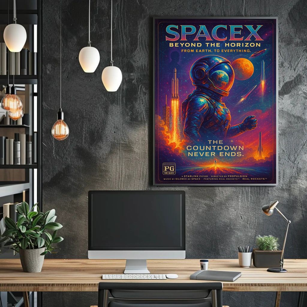 This SpaceX rocket launch print blends celestial imagery, inspirational copy (“The countdown never ends.”), and cinematic scale to make a statement above a desk, sofa, or in a home office. It also complements collections themed around space travel, astronaut art, and retro‑futuristic design.