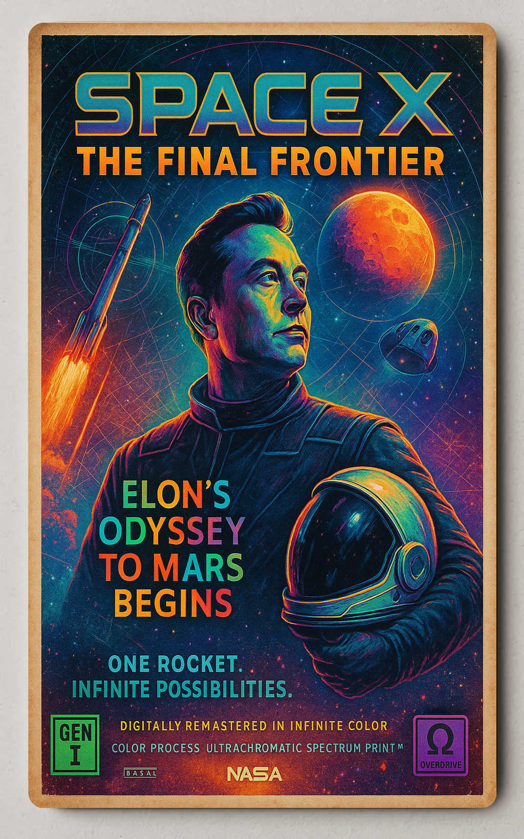 SpaceX The Final Frontier Trading Card from PosterGoats is a striking collectible trading card that captures the spirit of modern space exploration. Rendered in vivid, ultrachromatic color, this art-forward card showcases a heroic portrait, a blazing rocket launch, a distant Mars, and a reflective astronaut helmet—every detail designed to celebrate the innovation and ambition behind interplanetary travel.