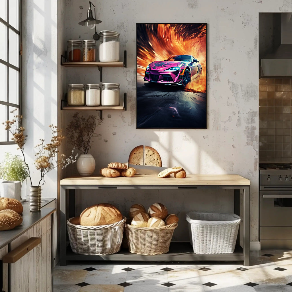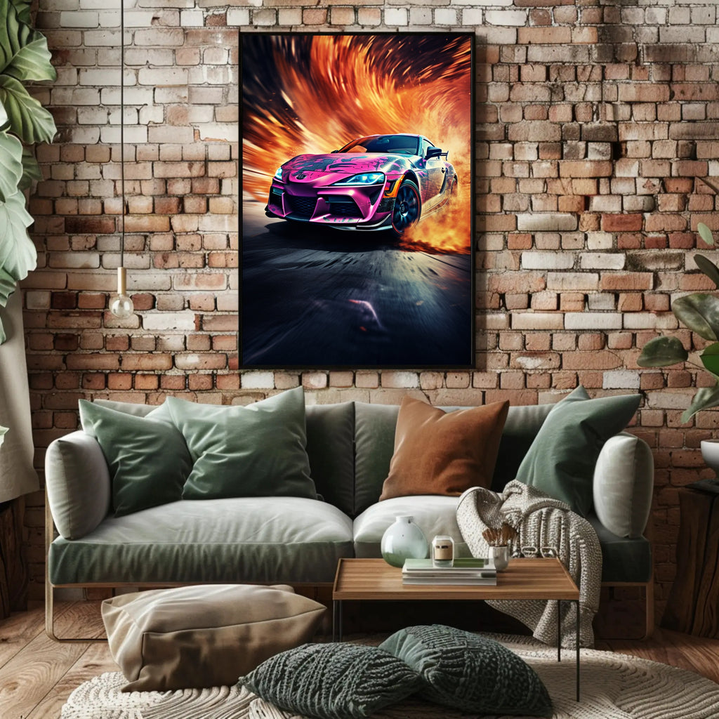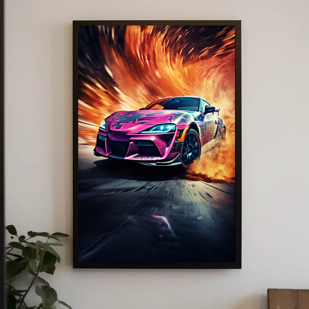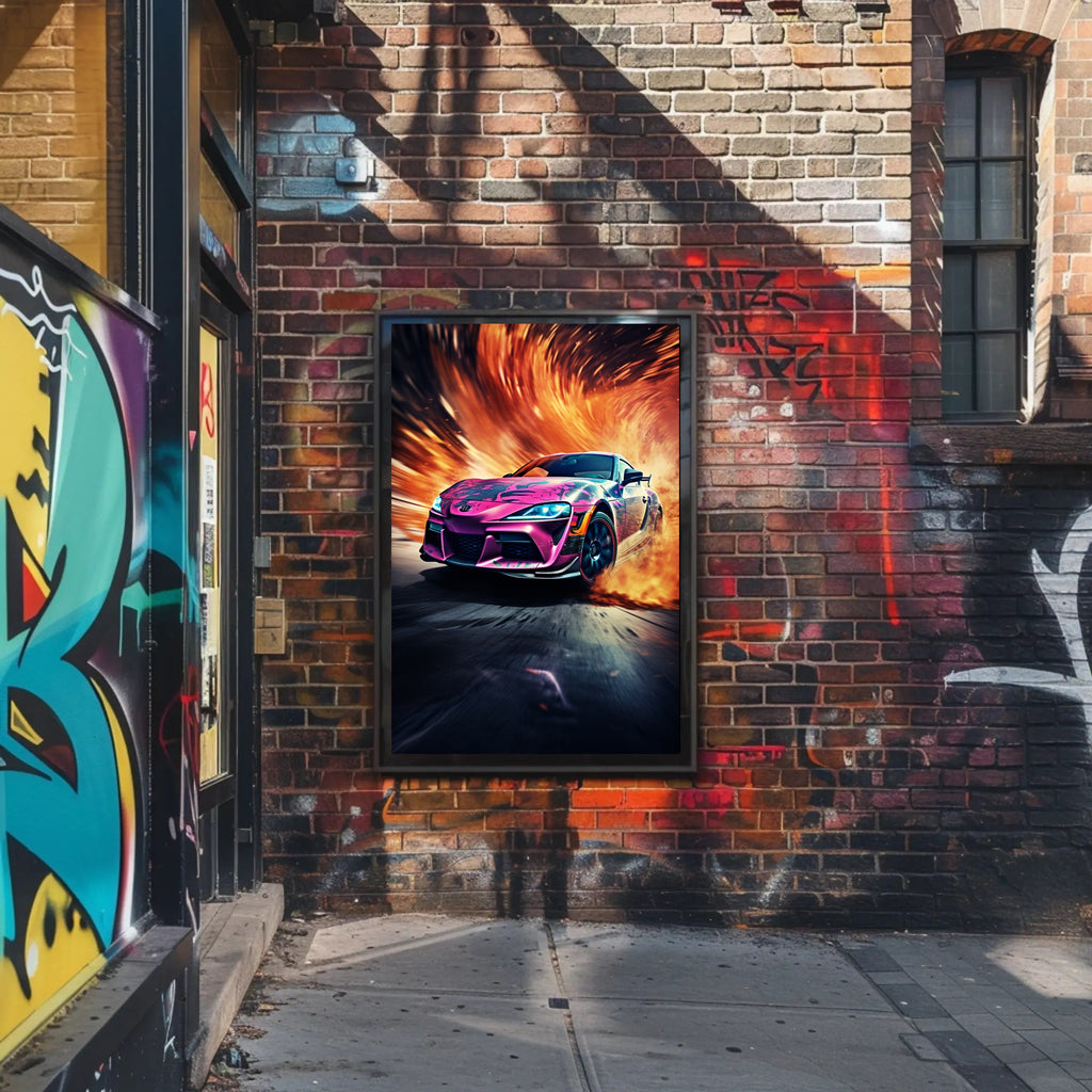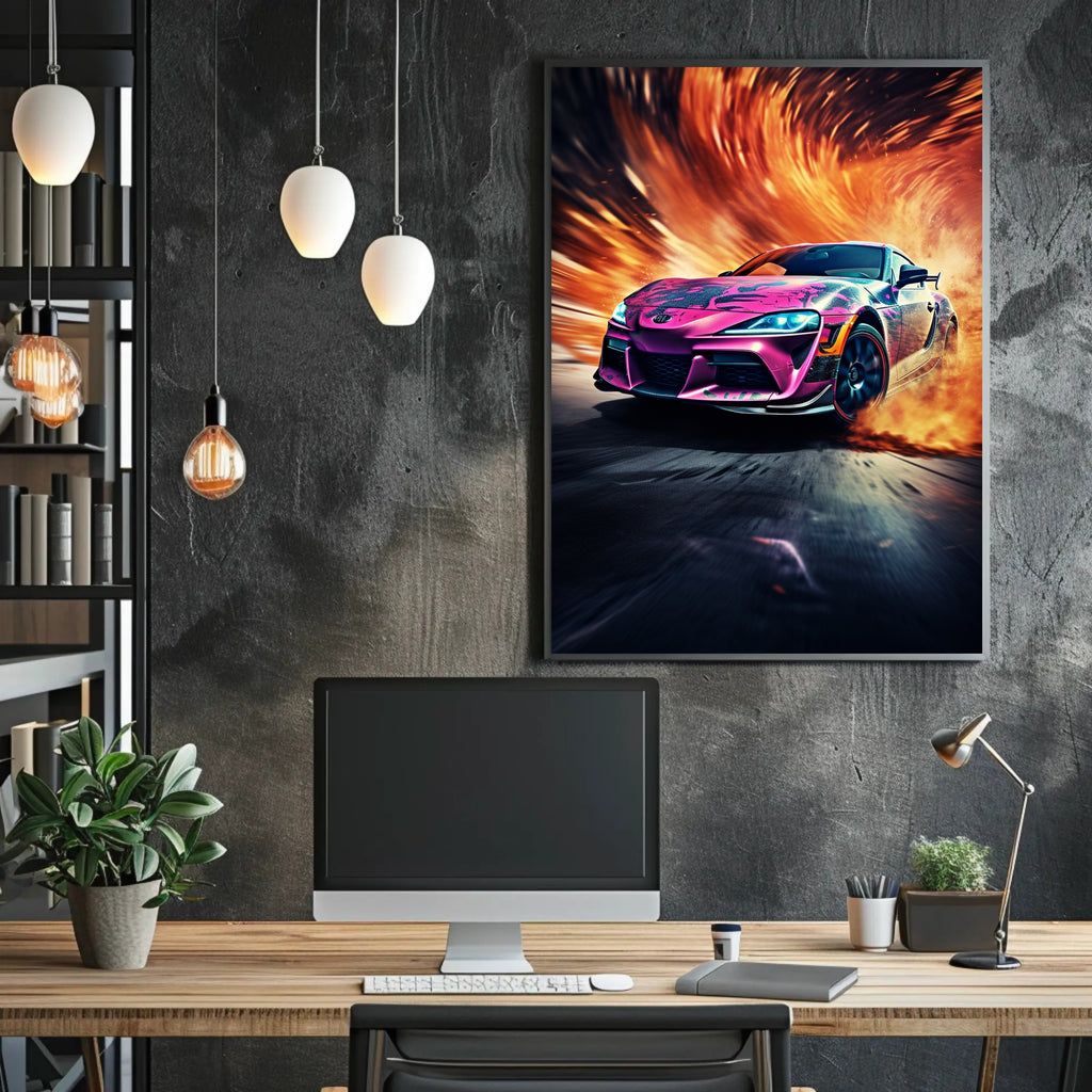 Ignite your walls with the Speed and Flames Poster from PosterGoat — a high-energy automotive art print that fuses racing adrenaline with bold, fiery visuals. This 18x24 poster captures a sleek sports car bursting through a swirl of blazing flames and motion-blurred asphalt, creating a dynamic centerpiece for any modern home, garage, or office.
