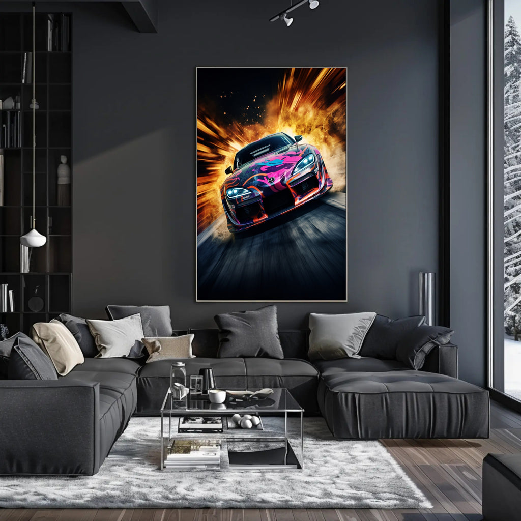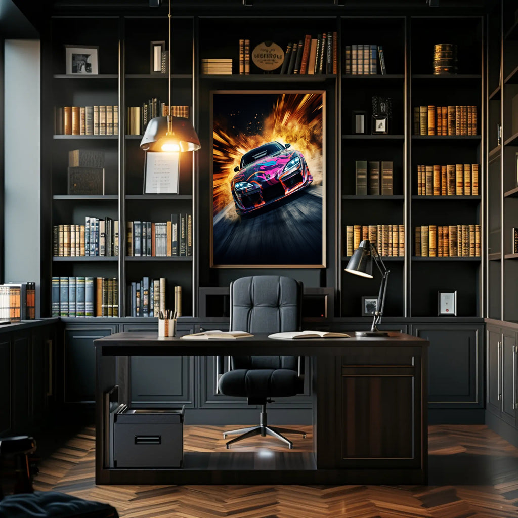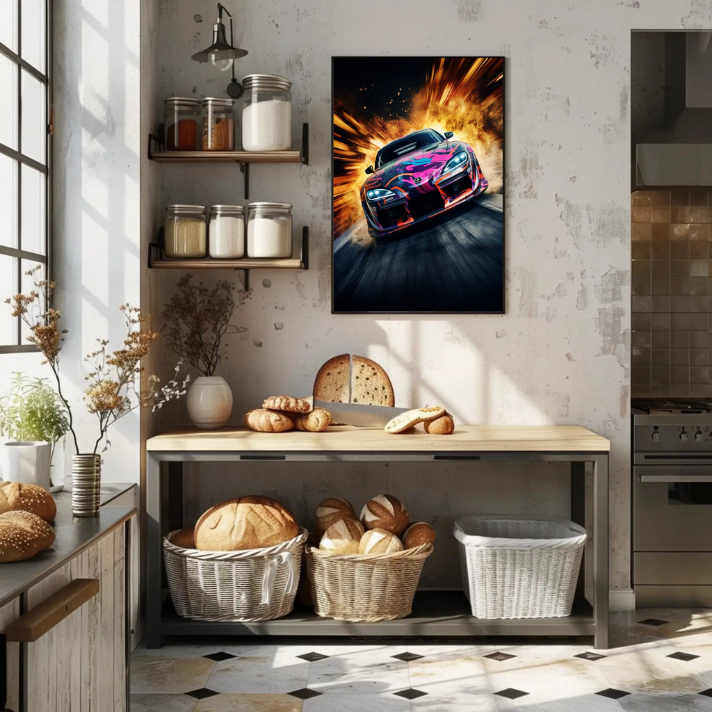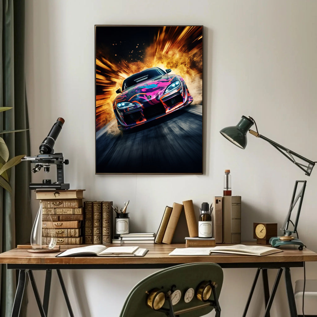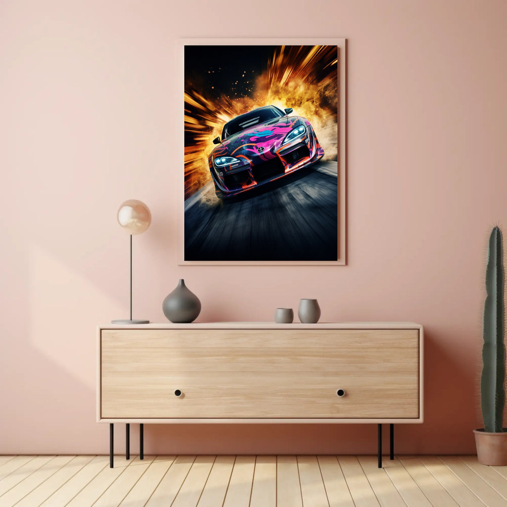 Bring the rush of the racetrack indoors with the Speed and Fury Poster from PosterGoat — a high-energy automotive art print that fuses pop-art color with explosive motion for a striking focal point in any room.