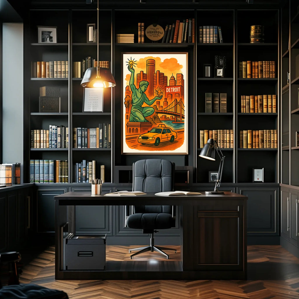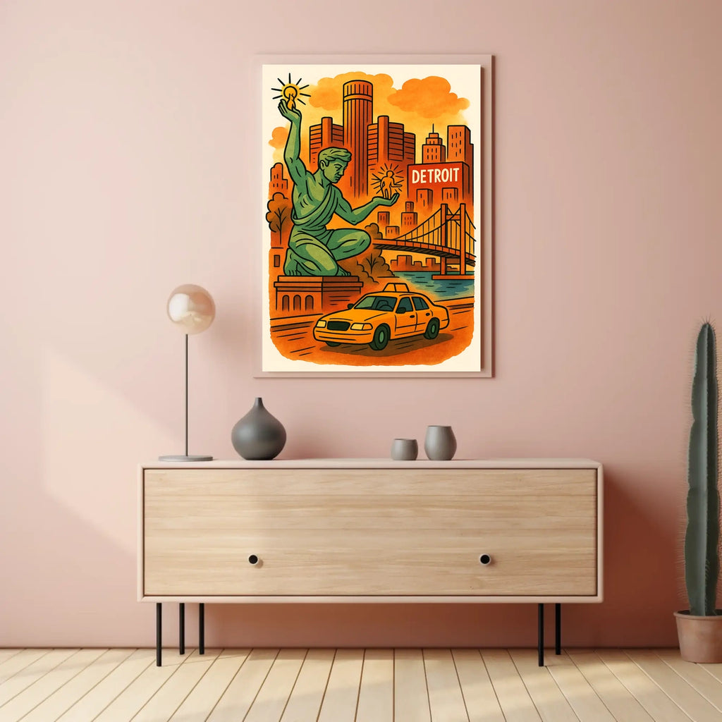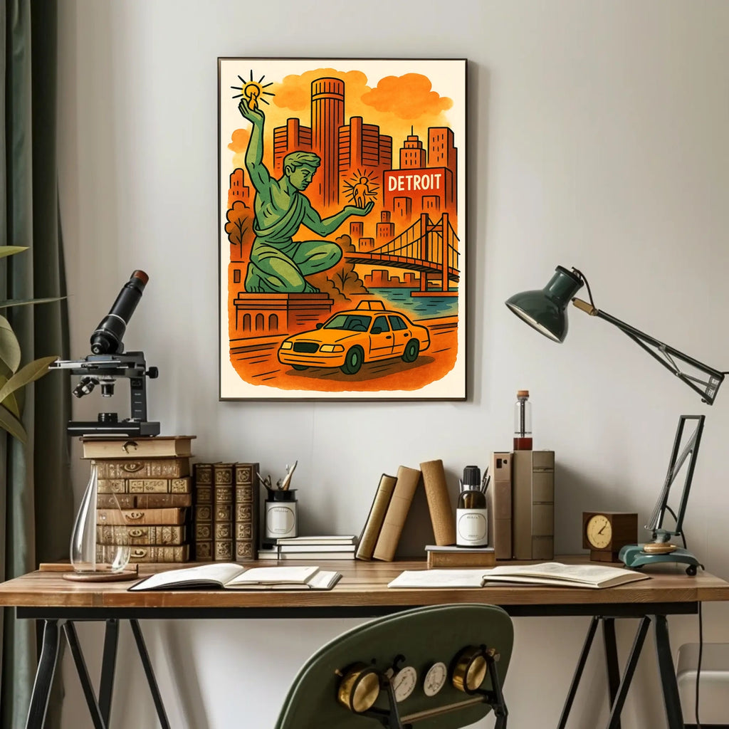 Immerse your walls in Detroit's vibrant energy with the Spirit of Detroit Art Poster. This striking piece merges the iconic Spirit of Detroit statue, a sweeping city skyline, and a cheerful yellow taxi to celebrate the city's cultural tapestry. Perfect for living rooms, offices, or study spaces—ideal for home decor—this piece adds urban charm, pride, and inspiration to any room.