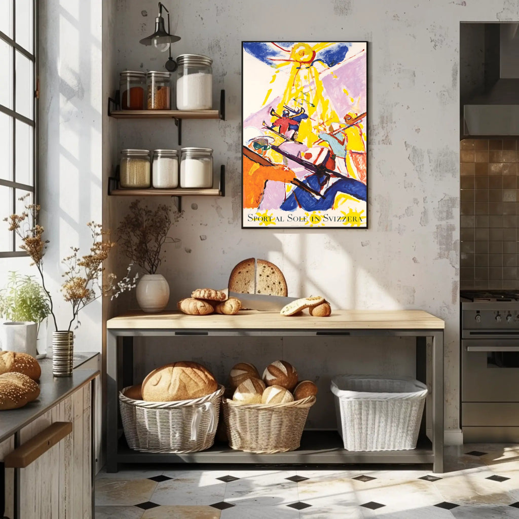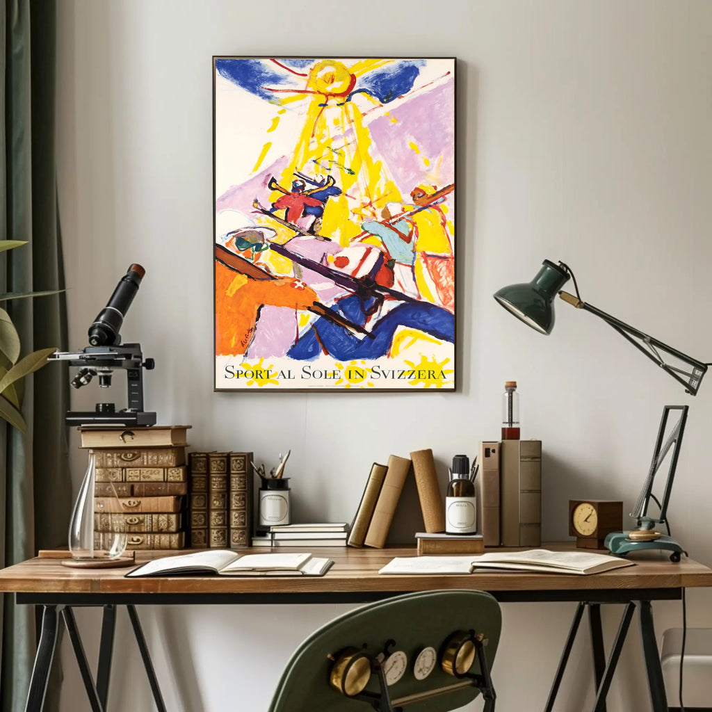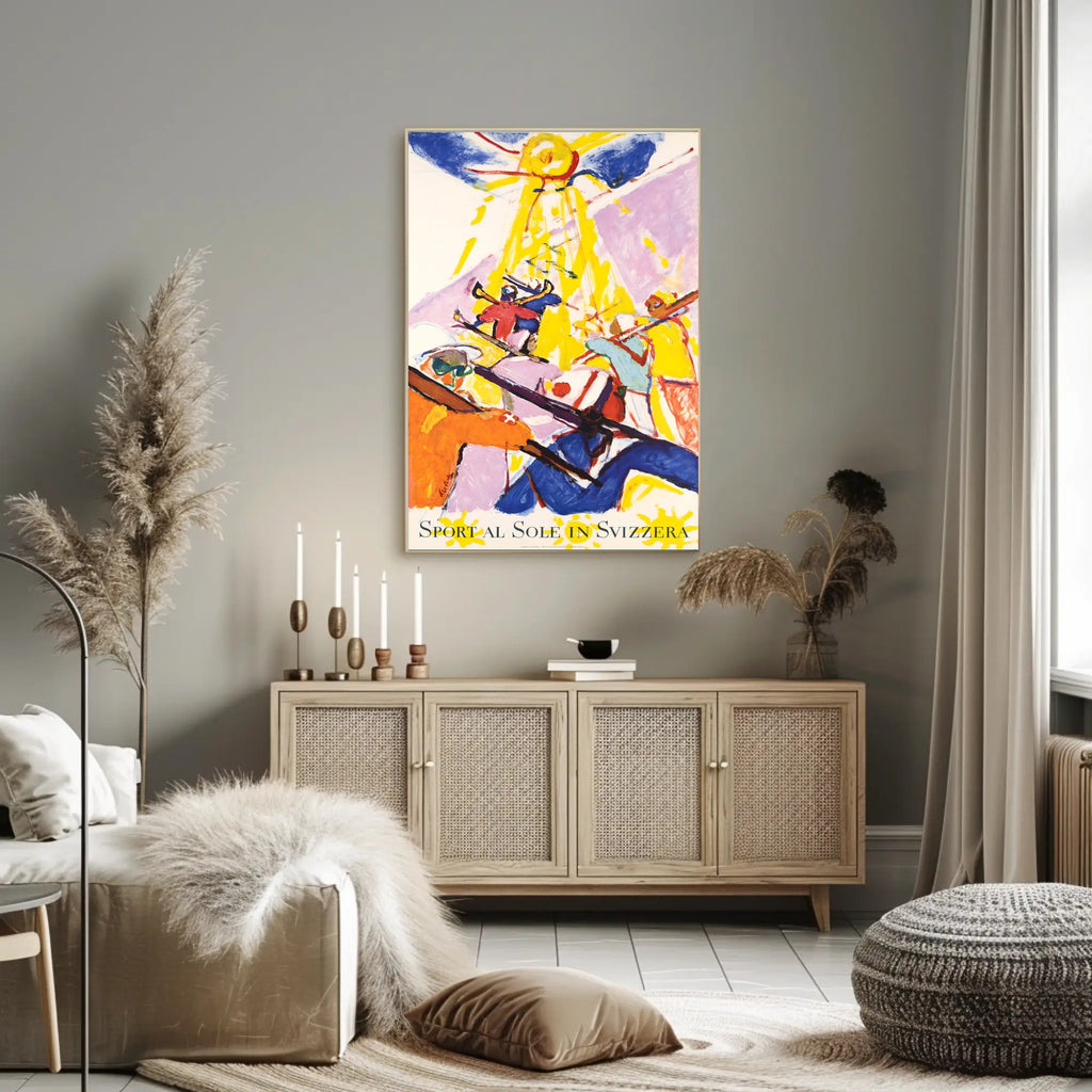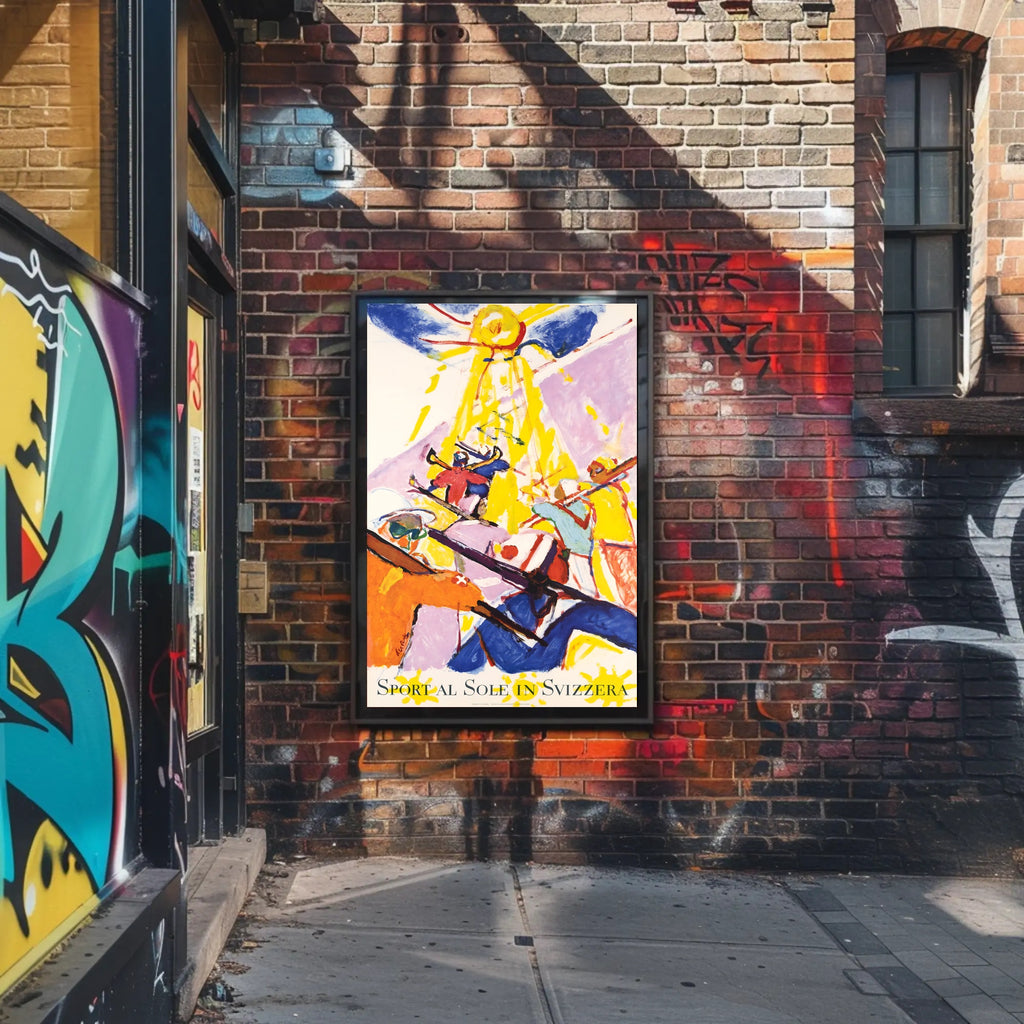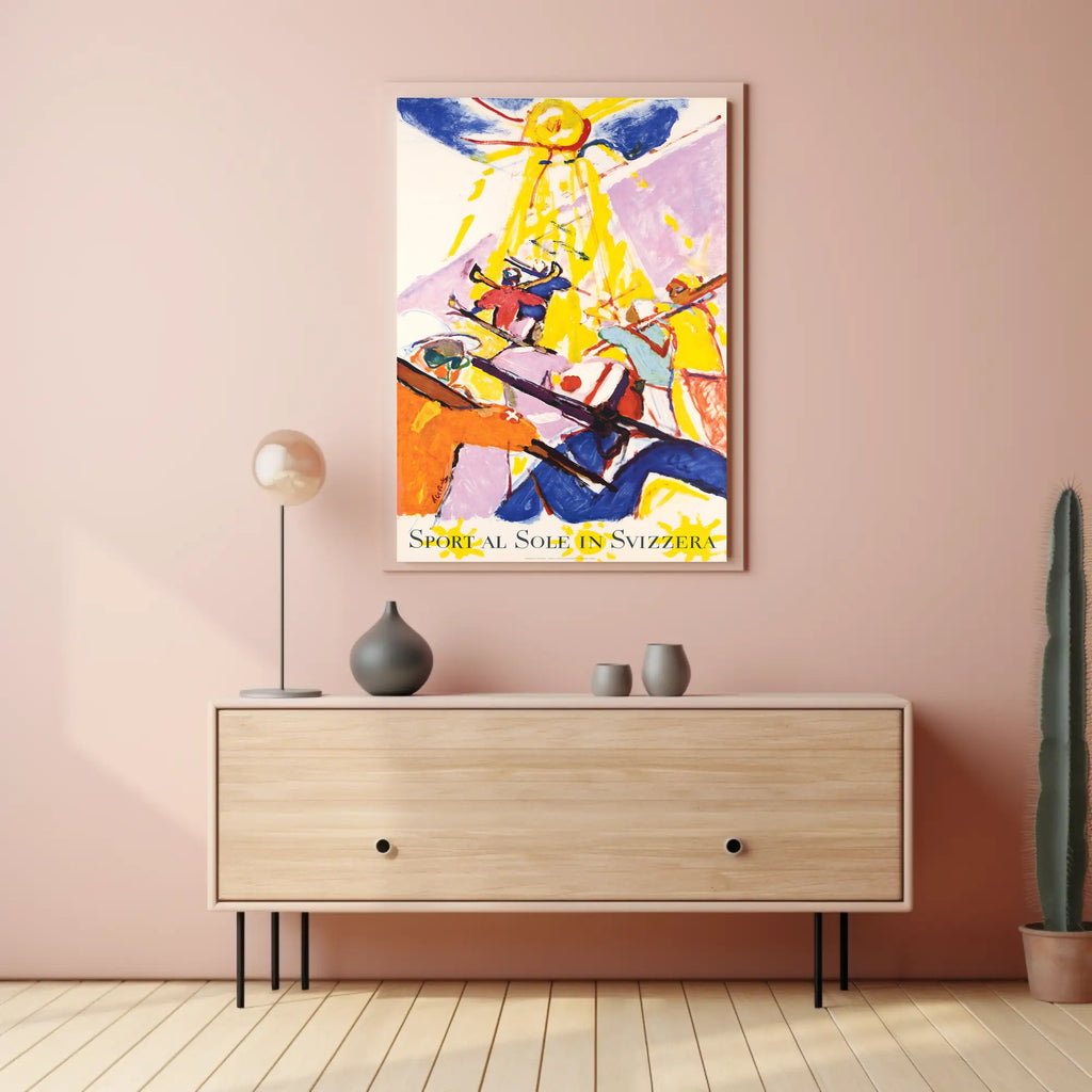 Bring the energy of alpine sun and outdoor sport into your home with the "Sport and Sun in Switzerland" poster by PosterGoat. This vibrant art print combines bold, expressive brushstrokes and a minimalist composition to evoke sunlight streaming over skiers and mountainous terrain — perfect for travel lovers, nature inspired decor, and fans of scenic artwork.