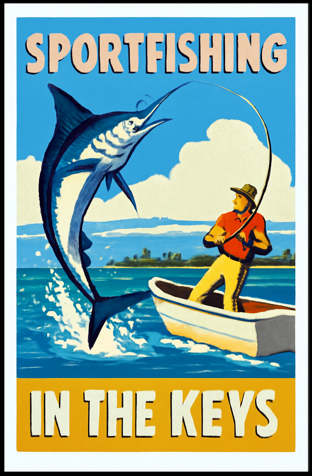 This poster captures the essence of Sportfishing in the Keys. Designed for decor lovers and wanderlust spirits, this art print adds charm to any room with visuals inspired by real-world scenery.