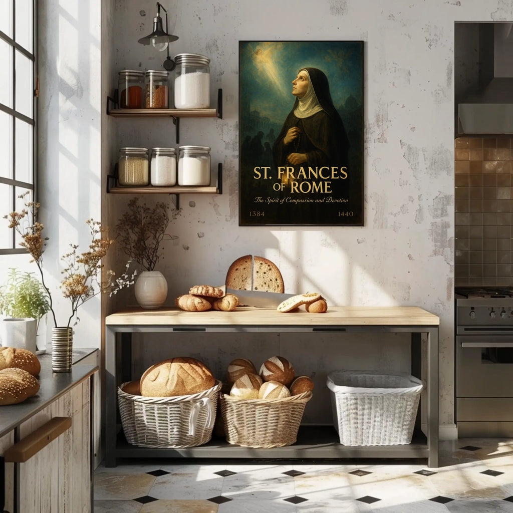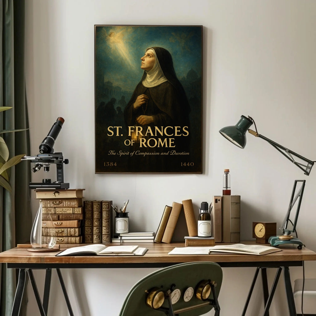 This poster captures the essence of St. Frances of Rome and the Spirit of Compassion and Devotion, blending reverent imagery with decorative charm. Ideal for living rooms, studies, or hallways, it invites reflection while elevating any wall with serene scenery and meaningful faith-inspired beauty.