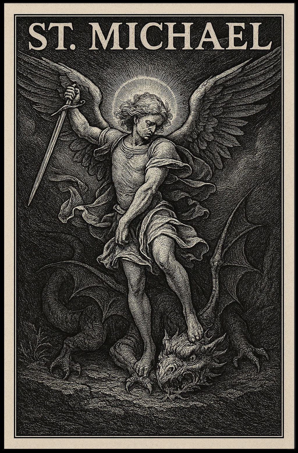 - Detailed design highlighting St. Michael's iconic pose and celestial imagery