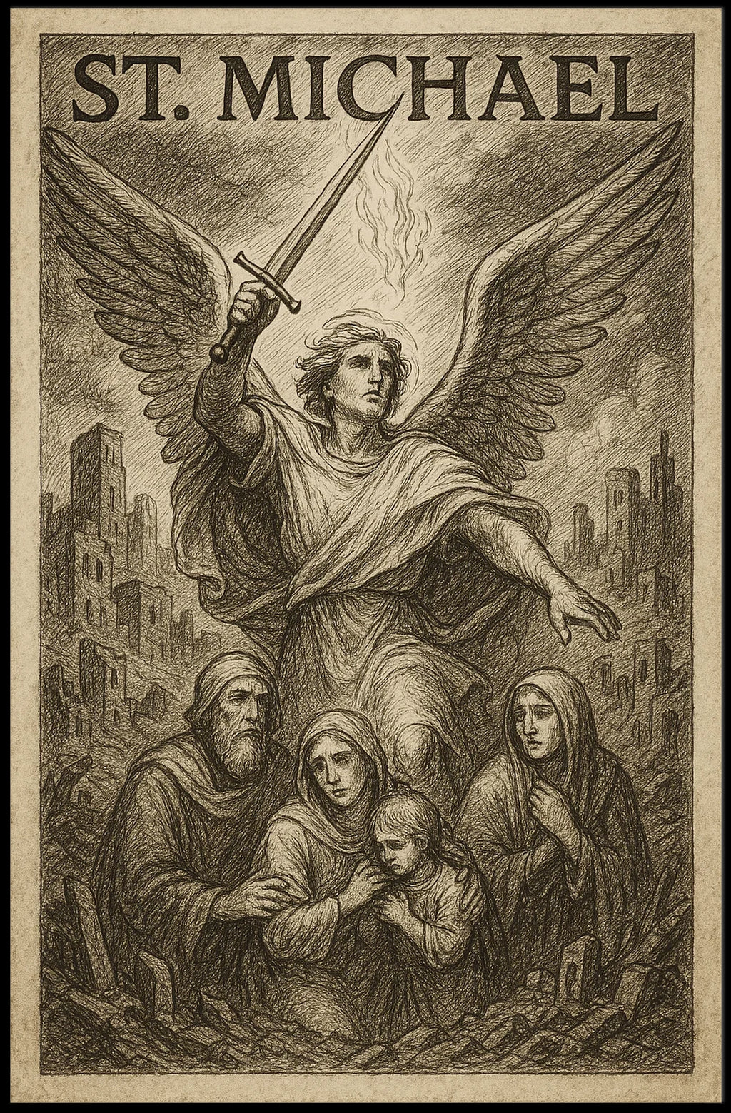 Detailed design highlighting St. Michael's guardian stance and radiant aura