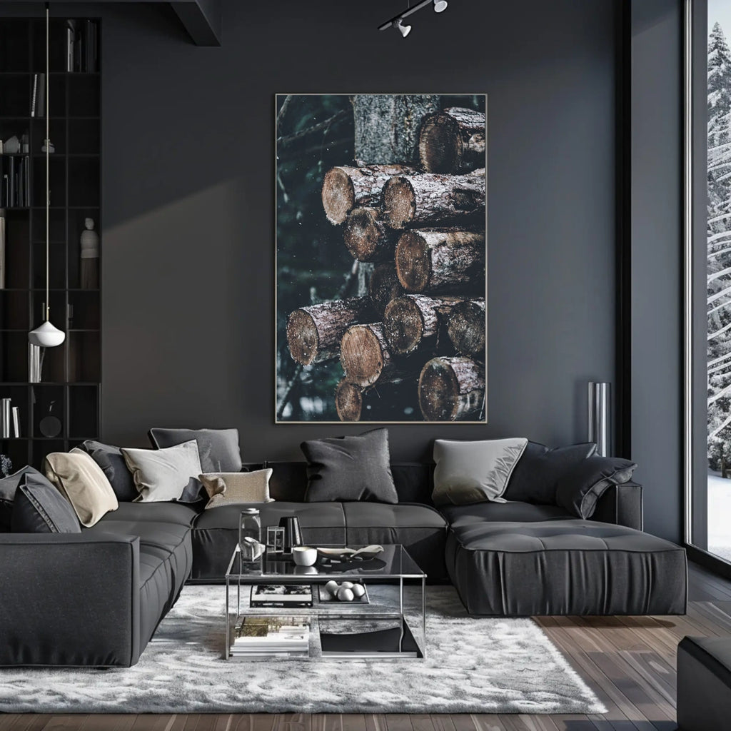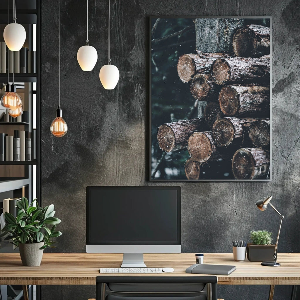 Bring the tranquility of nature into your space with this photorealistic poster depicting a close-up of stacked logs in a serene woodland setting. Snowflakes gently drift in the air, hinting at a late autumn or early winter day. This artwork captures the rustic beauty and calming essence of a forest, featuring a muted color palette of earthy browns and dark greens. Its intricate detail and texture evoke a timeless, vintage feel. Ideal for those who appreciate nature conservation or rustic decor, this piece will add a peaceful, contemplative touch to any room.
