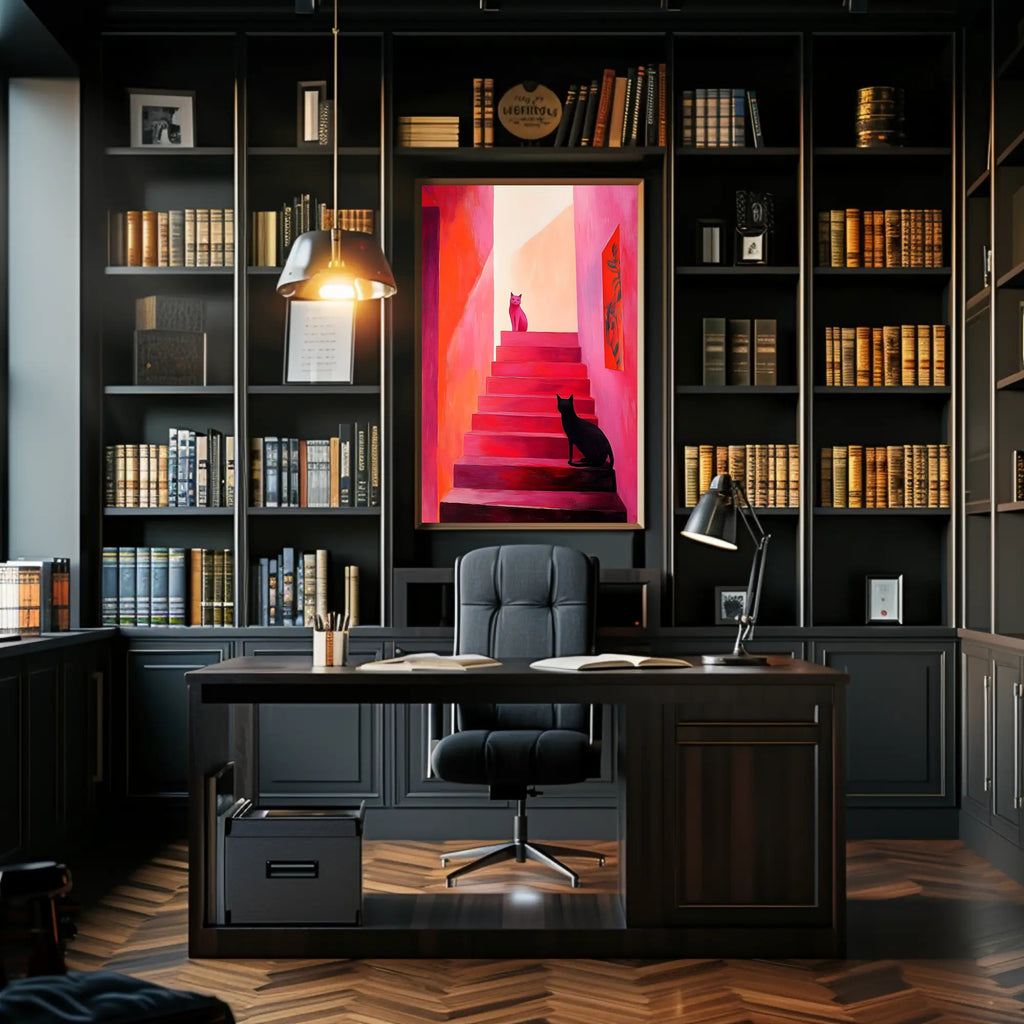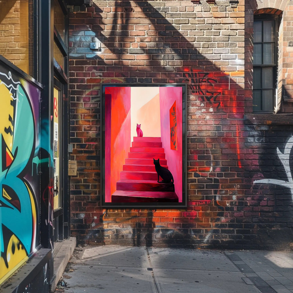 Rendered with clean lines and bold color blocking, the composition draws the eye up the staircase from a shadowed black cat in the foreground to a bright pink companion waiting at the top. The result is an evocative piece of wall art perfect for living rooms, hallways or any space that needs an instant pop of personality.