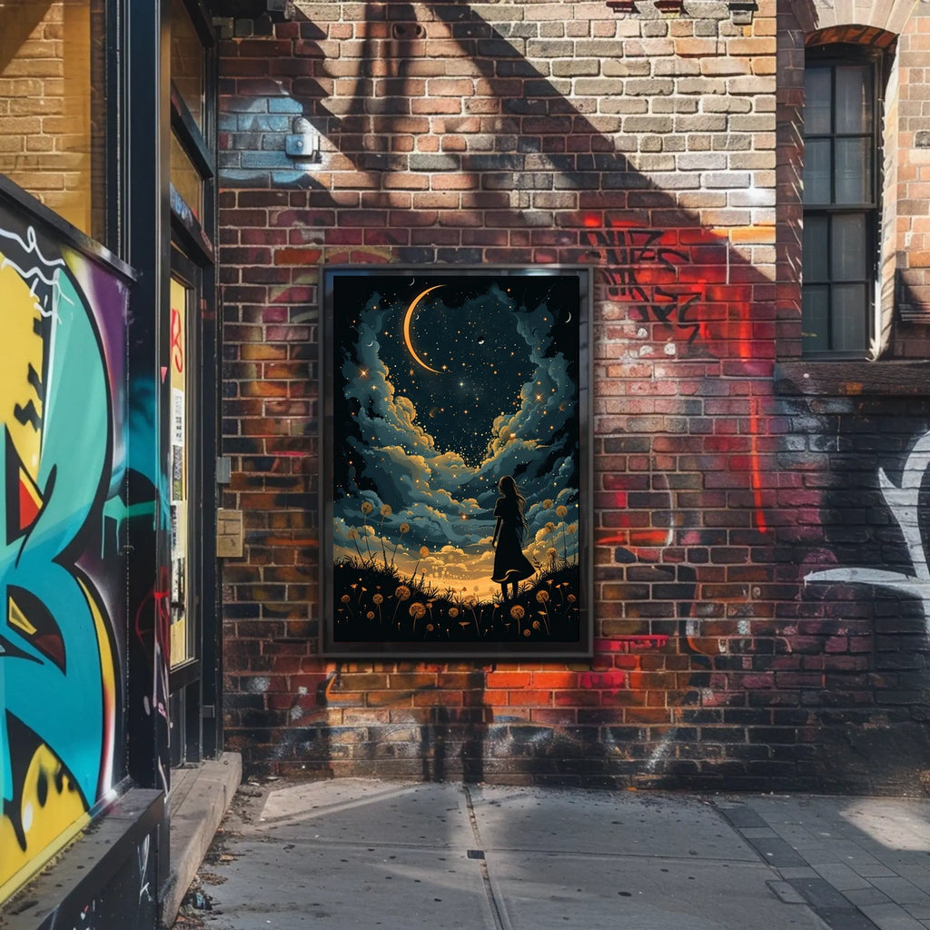 Immerse your space in celestial whim with Stargazers Dream, a poster that captures a lone silhouette in a field of dandelions gazing at a starry night. This ethereal scene blends wonder and calm, turning any wall into a moment of quiet inspiration.