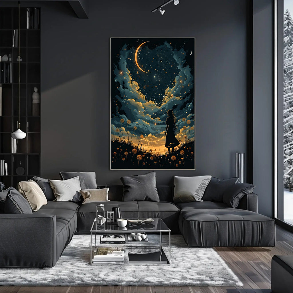 - Dreamlike mood — The ethereal dandelion meadow and crescent moon evoke serenity, helping rooms feel more relaxing and inviting.