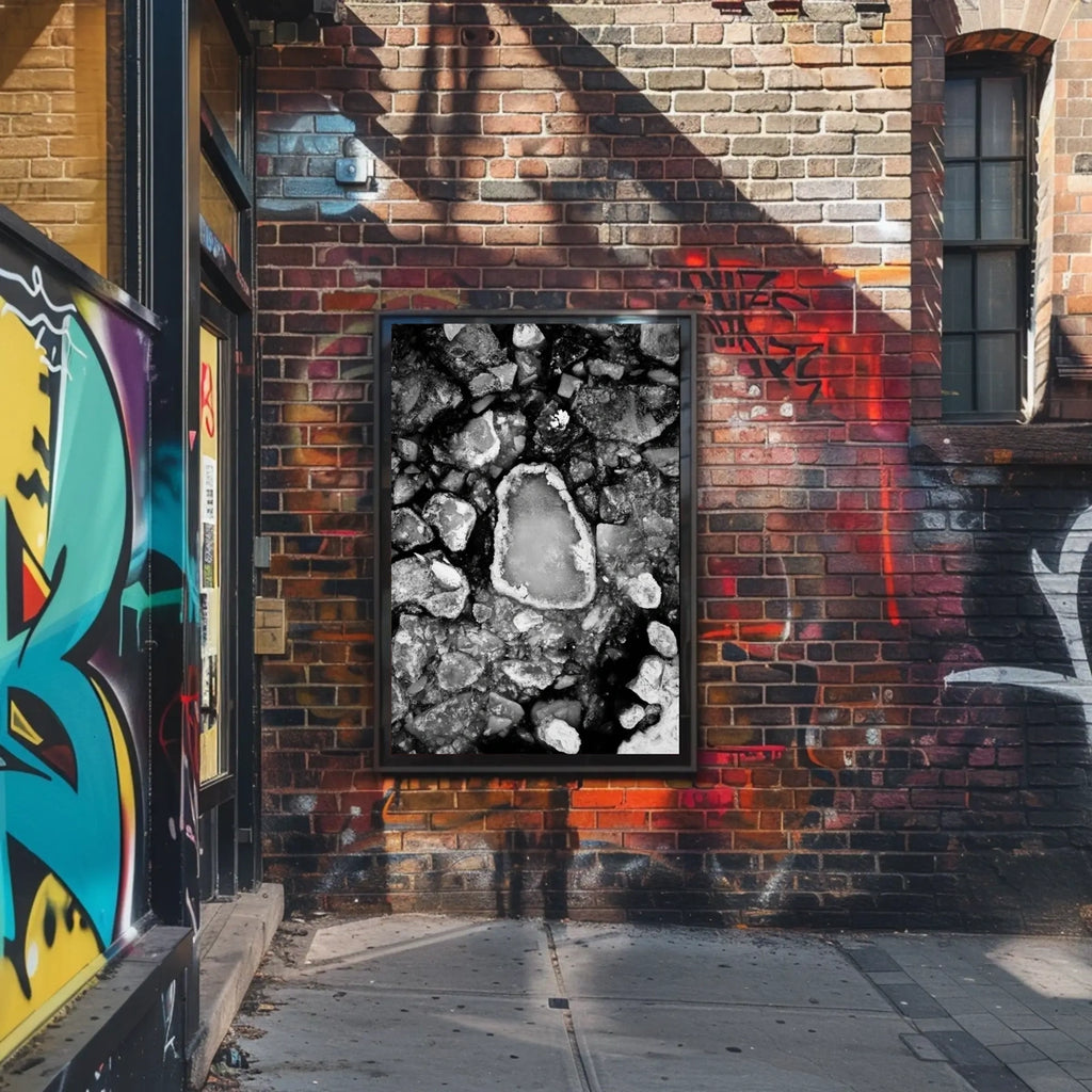Stark Black and White Abstract Ice Formation Poster invites you to immerse yourself in the captivating world of abstract photography. This striking poster features a photorealistic depiction of intricate ice formations against a dark background. The monochrome palette accentuates the dramatic contrast between the icy textures and the surrounding shadows, creating a bold visual statement. Each piece of ice varies in shape and size, ranging from jagged edges to smoother, rounded forms. This artwork evokes a sense of solitude and the stark beauty of winter landscapes, making it a compelling addition to any space that celebrates the elegance of nature's colder seasons.