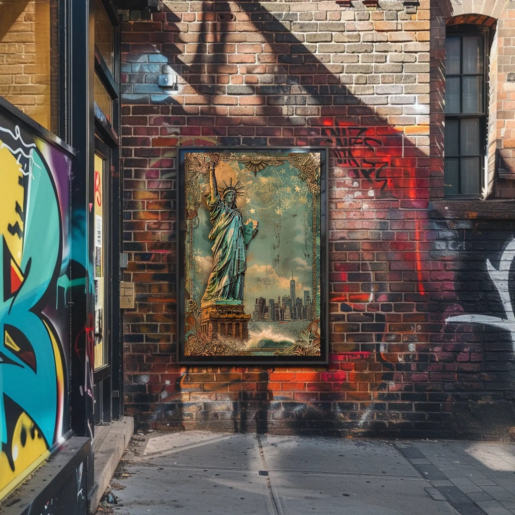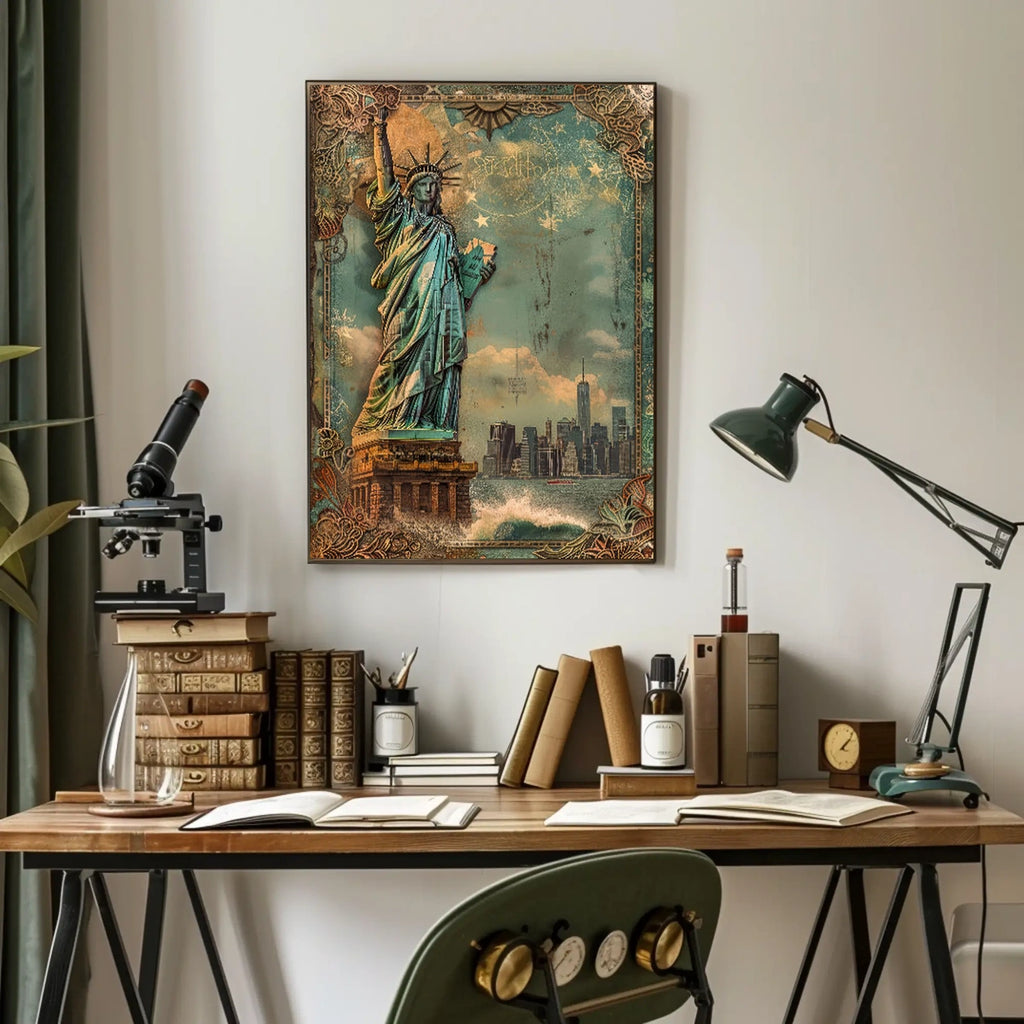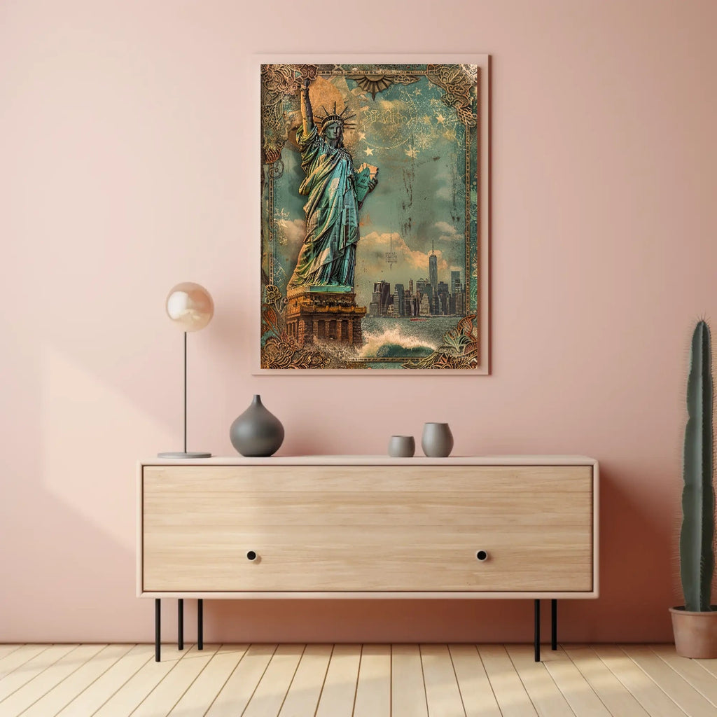 Intro: Immerse yourself in the iconic American spirit with this vintage-style illustration of the Statue of Liberty against the New York City skyline. The muted greens and browns evoke a nostalgic aesthetic, while weathered textures and ornamental borders add timeless charm to any wall.
