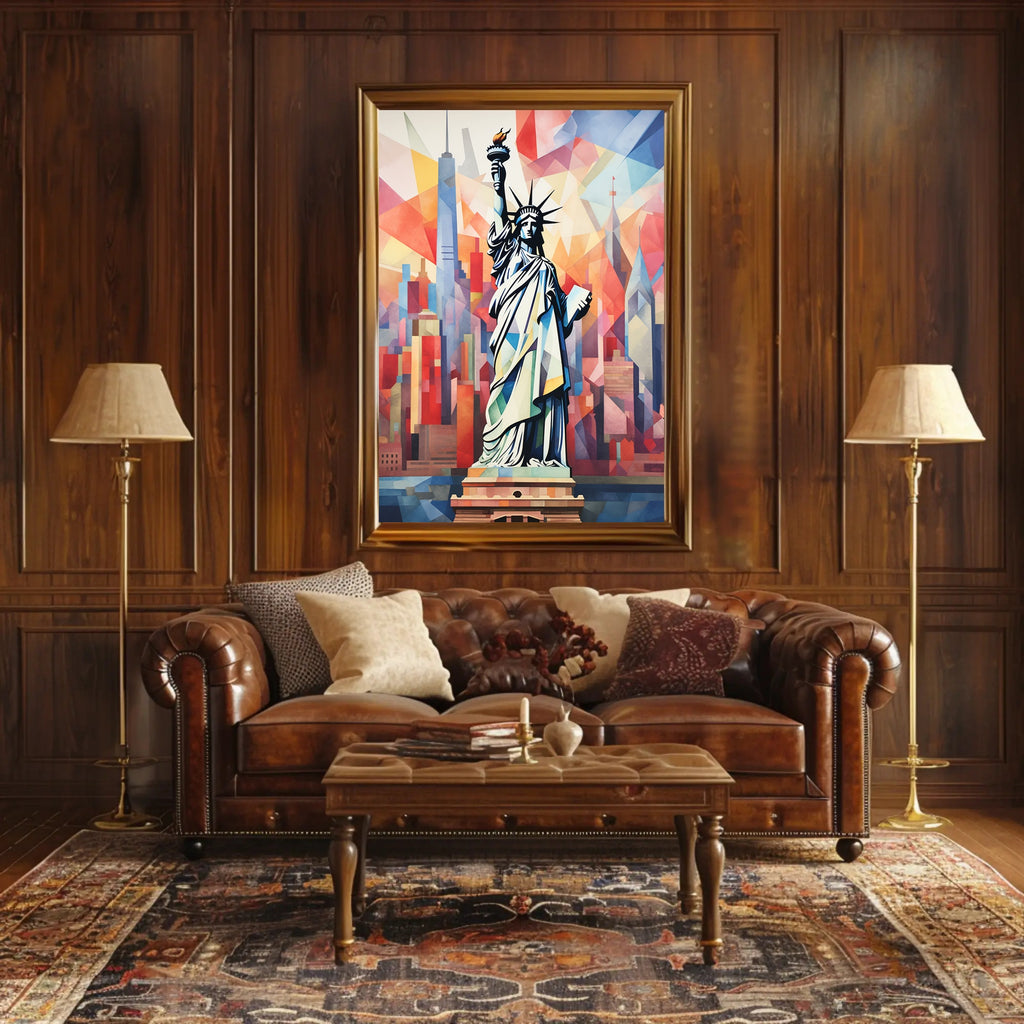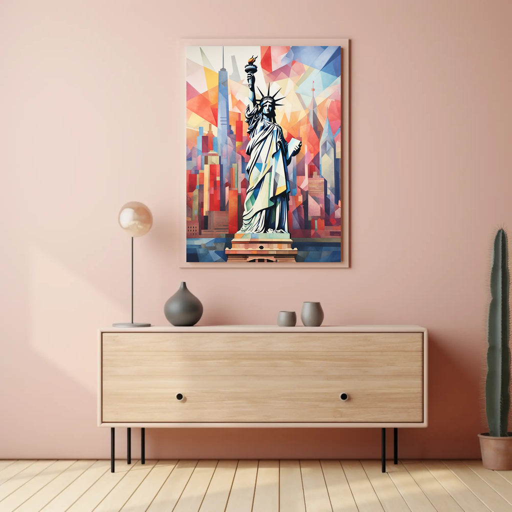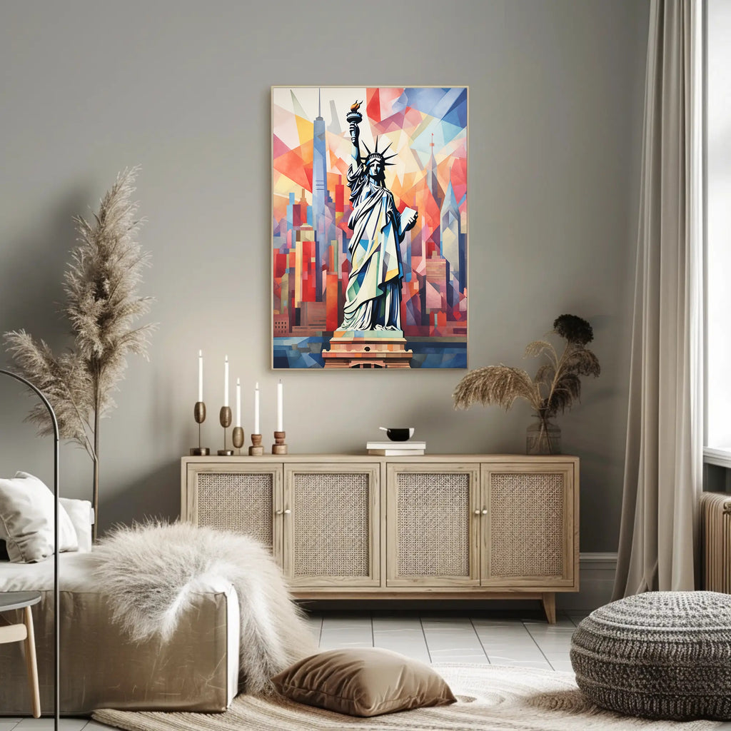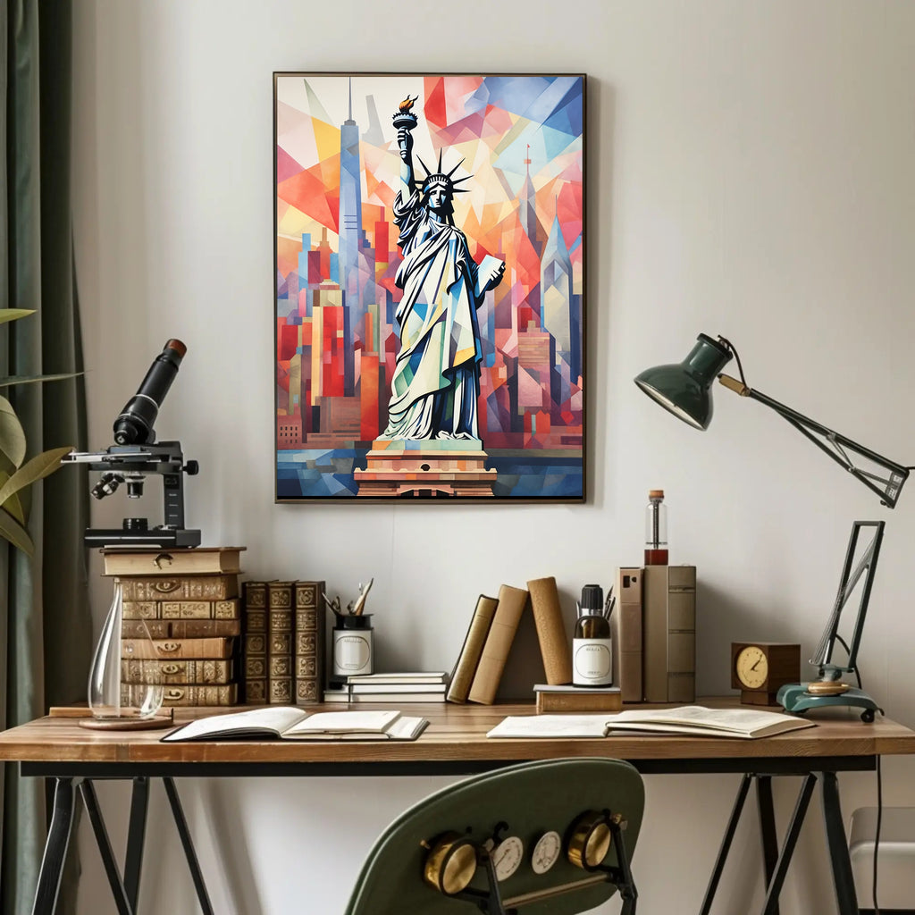 This geometric New York art print is ideal for collectors of urban landscape art and fans of contemporary decor who want a bold centerpiece that celebrates cultural identity and the dynamic energy of the city. Add a burst of color and a symbol of freedom to your space — order your PosterGoat poster today and transform your wall into a vibrant homage to New York.