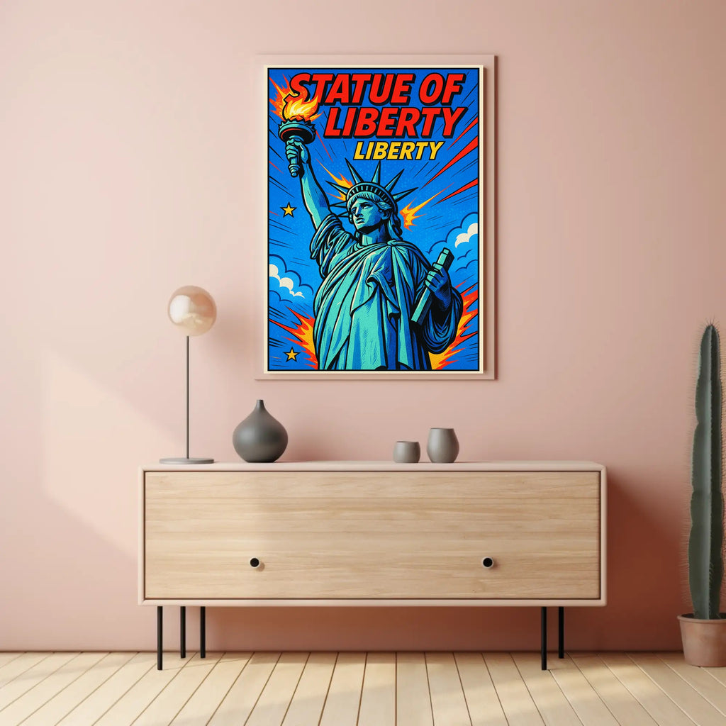 - Eye-catching design: Dynamic illustration of the Statue of Liberty with high-contrast colors, bold red headline text and a glowing torch—perfect for modern and minimalist decor.