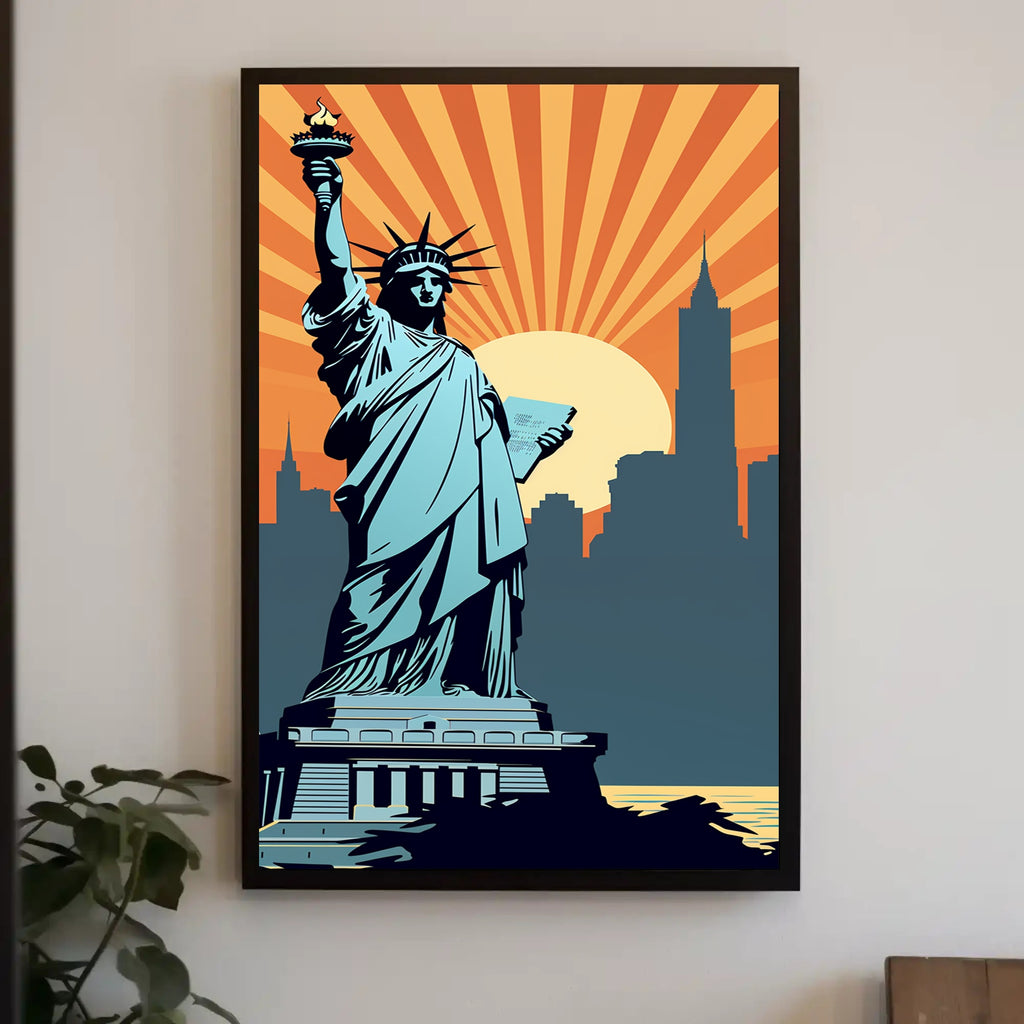 This eye-catching cityscape print uses warm orange sunrays and a large sun silhouette to spotlight the statue's torch and crown—visual symbols of freedom and hope—while the simplified skyline and deep blue tones create powerful contrast and vintage appeal.