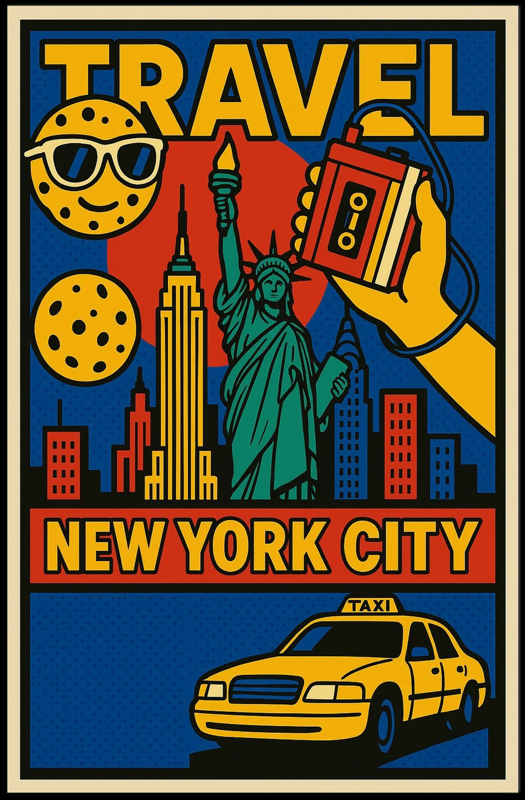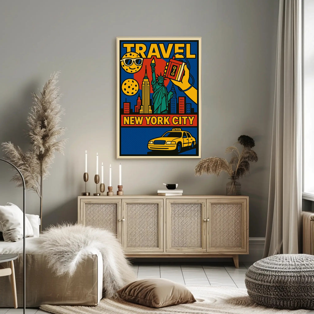 Immerse yourself in the vibrant energy of New York City with the stunning Statue of Liberty New York Travel Poster. This dynamic artwork not only showcases the iconic Statue of Liberty but also cleverly entwines a stylized skyline that nods to the Empire State Building. The modern twist featuring a classic yellow taxi and playful emoji-like symbols adds a contemporary flair, making this poster an essential decor piece for travel enthusiasts and urban art lovers alike. With bold, comic-like graphics in vivid primary colors, this travel poster captures the lively hustle and bustle of NYC and evokes a sense of adventure and exploration.