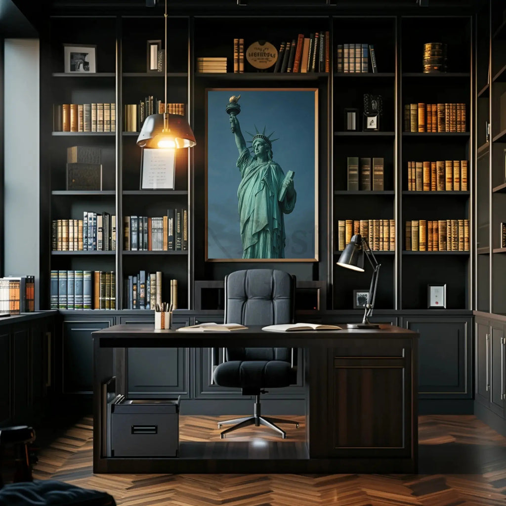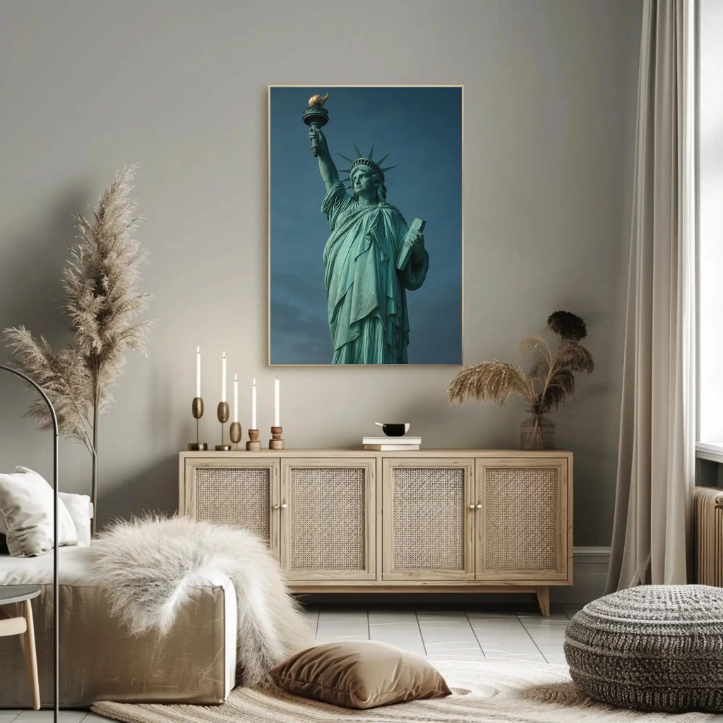 Why you'll love it: This museum-quality print highlights the statue’s iconic patina, sculptural folds and torch detail against a moody sky, delivering a powerful focal point for living rooms, offices, galleries or educational settings. The high-contrast, realistic composition evokes an enlightenment theme while preserving the monument’s historical gravitas.