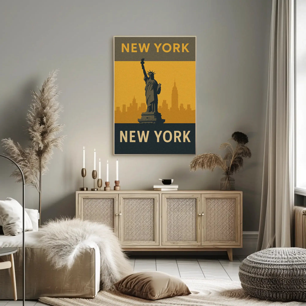 Celebrate New York's enduring spirit with the Statue of Liberty Retro Design Travel Poster from PosterGoat. This striking minimalist print pairs bold shapes and vintage-inspired typography with a muted gold and dark gray palette, creating a timeless focal point for any room. The silhouetted NYC skyline and iconic Lady Liberty silhouette deliver instant urban nostalgia and classic home decor appeal.