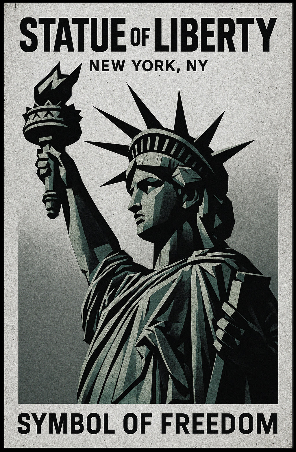 Celebrate freedom with vintage-inspired art. The Statue of Liberty Symbol of Freedom Poster from PosterGoat brings a bold, minimalist tribute to New York’s most iconic landmark into your home decor. This striking 18x24 poster features a geometric, high-contrast illustration of Lady Liberty rendered in muted teal and charcoal tones, framed by powerful headline typography that reads "STATUE OF LIBERTY" and "SYMBOL OF FREEDOM."