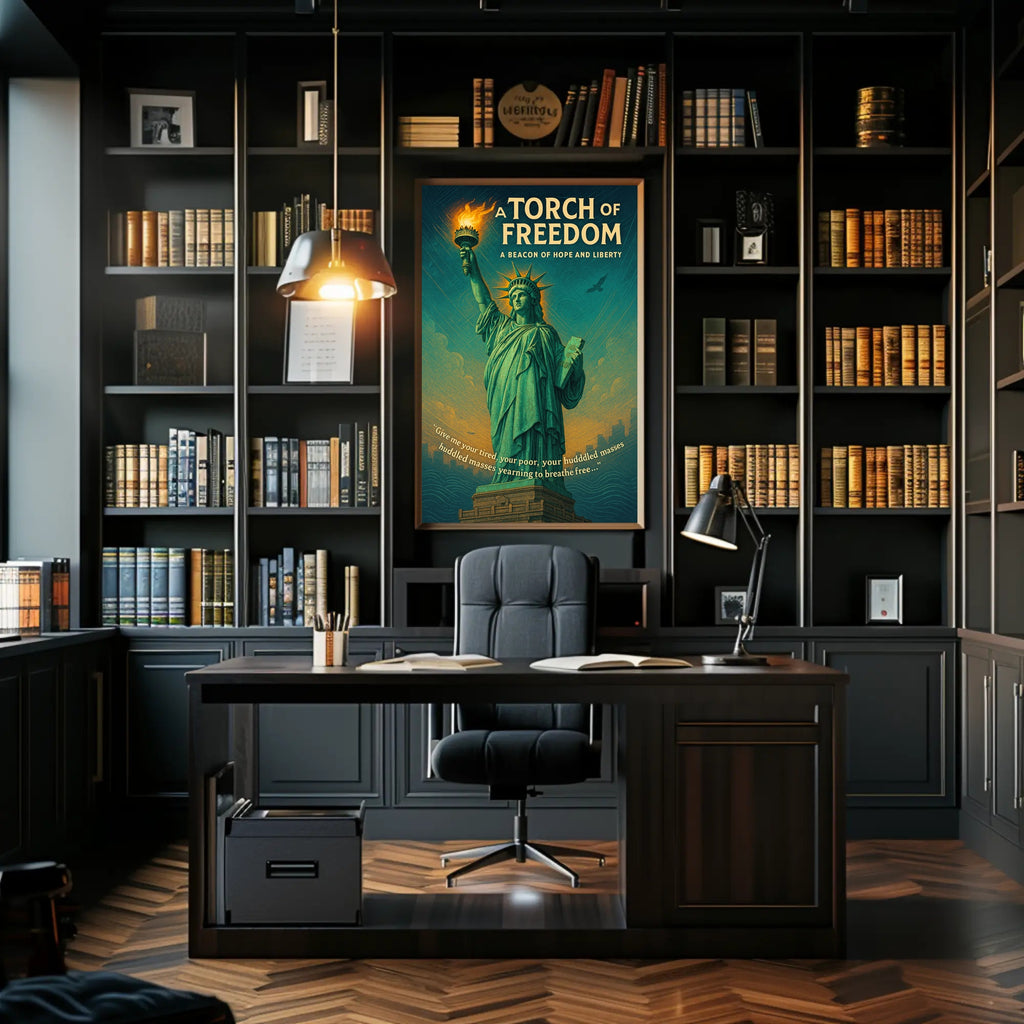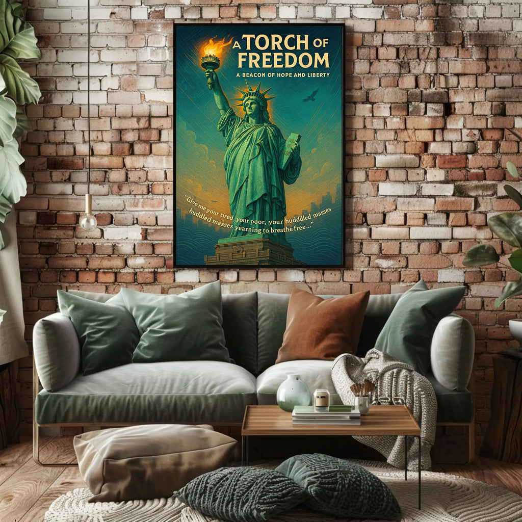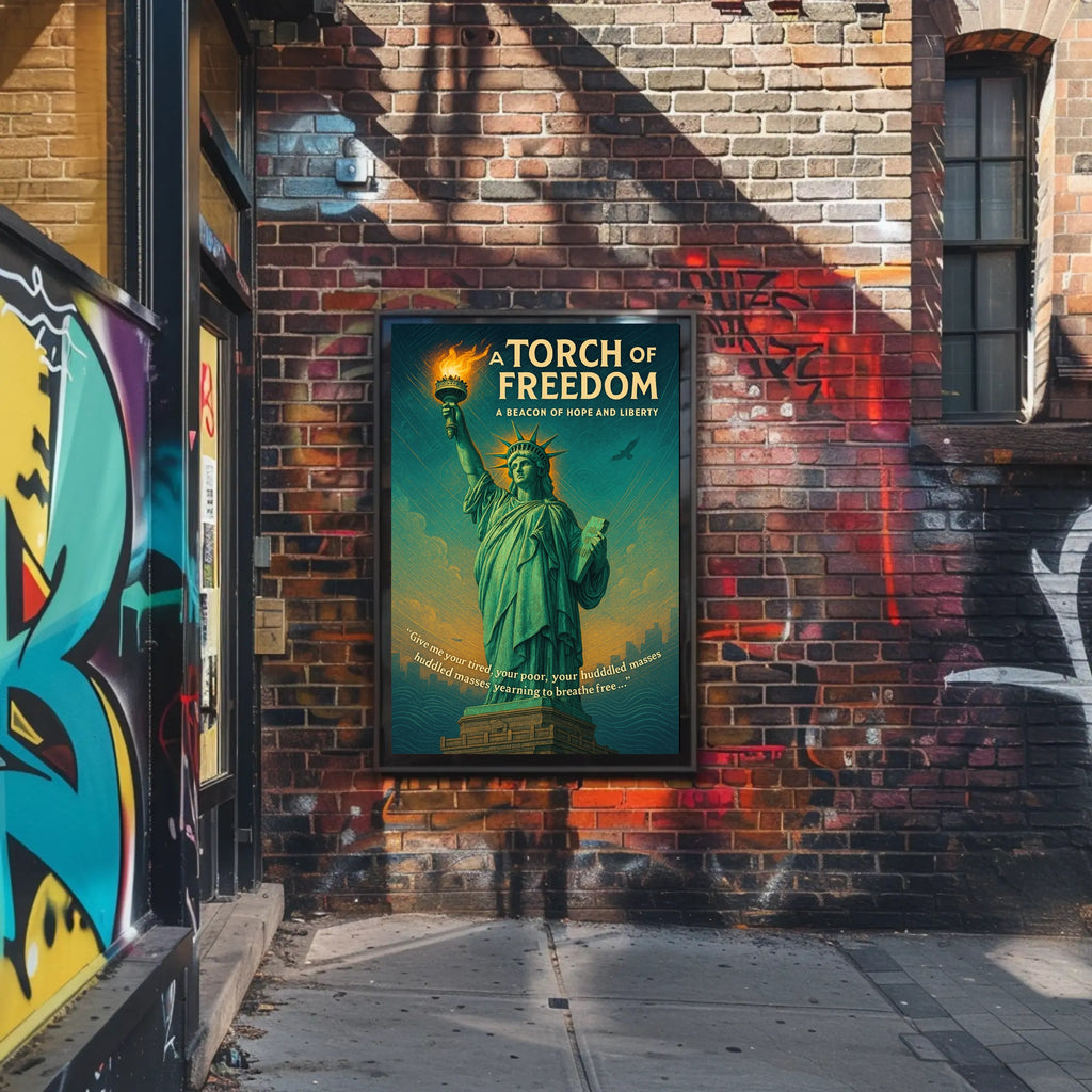 - Statement & message: Features the iconic torch, crown and tablet of the Statue of Liberty with the motivational line “Give me your tired, your poor…”—perfect as a patriotic poster or inspirational quote print.